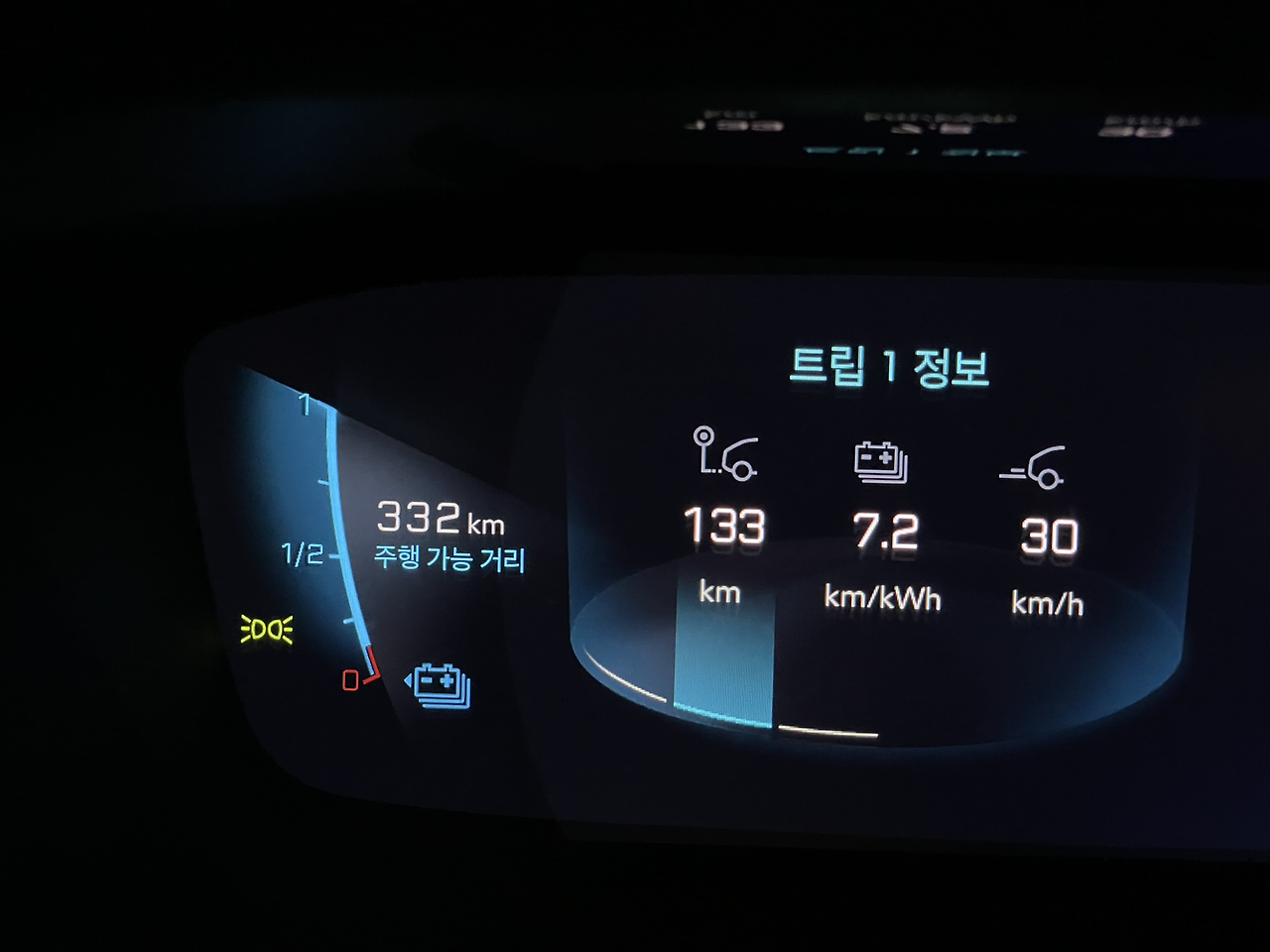 복합기준 공인 주행 가능거리가 260km, 전비는 4.9km/kWh인데… 100%로 충전하니 최대 주행가능거리는 332km가 찍히네요. 이래저래 133km 정도 달리는 동안 평균 전비는 7.2km/kWh로 매우 잘 나오네요. 특히나 이 동안 평균 속도가 30km 밖에 되지 않았는데 말입니다.