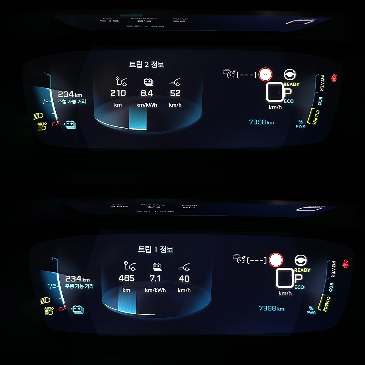 실제로 시승하며 확인한 걸로 배터리 19% 잔량 기준 주행거리 388km, 60km를 더 달릴 수 있다는 것을 확인했습니다. 104km 달리는 동안 최대 전비는 9.2km/kWh까지 올라가고 총 485km를 달리는 동안 평균 전비는 7.1km/kWh를 기록했습니다.