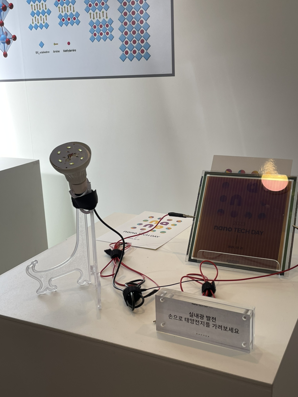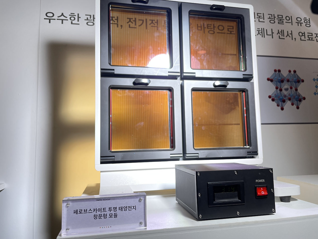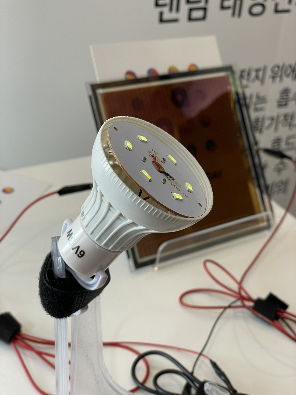 페로브스카이트라는 소재를 이용해 투명한 태양전지도 있었습니다. 그동안 많은 연구가 진행된 실리콘을 이용한 태양전지의 전환 효율이 26.8%인데, 페로브스카이트 소재를 쓴 것도 26.0%까지 올라갔다더군요. 이걸 거의 투명하게 만들면 자동차의 유리와 차체는 물론이고 건물 - 실제 현대건설과 협력 중이랍니다 -에 썼을 때 응용은, 무한대가 될 것 같더군요. 특히 발전 효율이 좋아 저조도(실내조명 등)에서도 6V 3W LED 라이트에 전원을 공급하는 모습이 인상적이었습니다. 전기차 지붕과 유리에 달아 꼭 야외가 아니라도 차 배터리를 충전하거나 전기 에너지를 회수할 수 있으니까요.