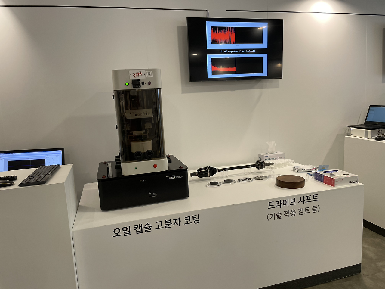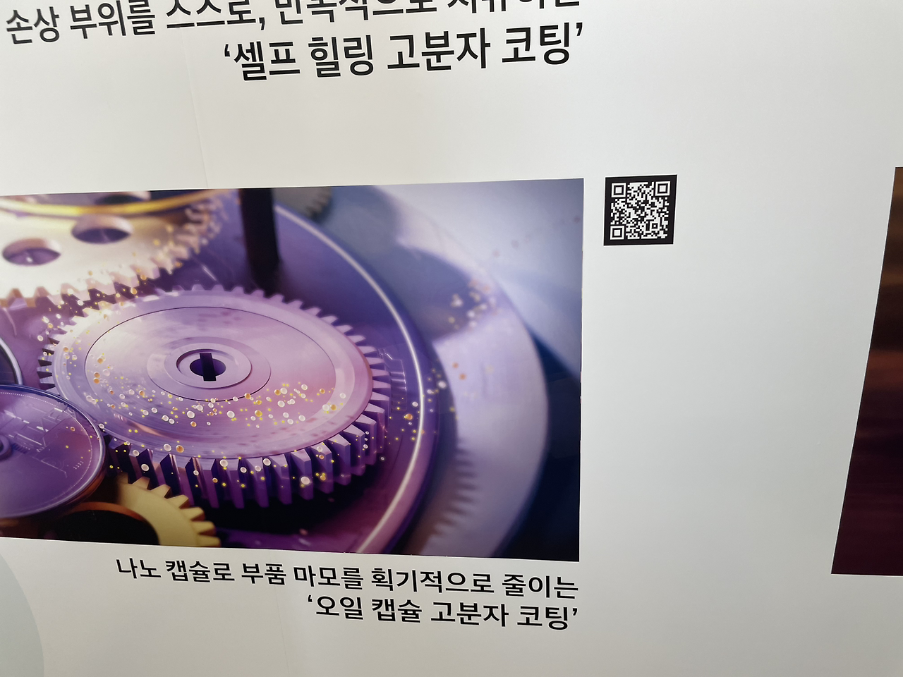 오일캡슐 고분자 코팅은 마찰 저항을 줄여 부품의 수명을 연장하고 효율을 높이는 것이 목적입니다. 실제로 고체(가루) 형태인데 문지르니 캡슐이 터지며 오일이 나오는 것이 신기했습니다. 이게 여성분들이라면 더 익숙할, 화장품 안에 포함된 캡슐에서 영감을 받았다는 발표가 인상적이었습니다. 그야말로 퓨전 과학이더군요.