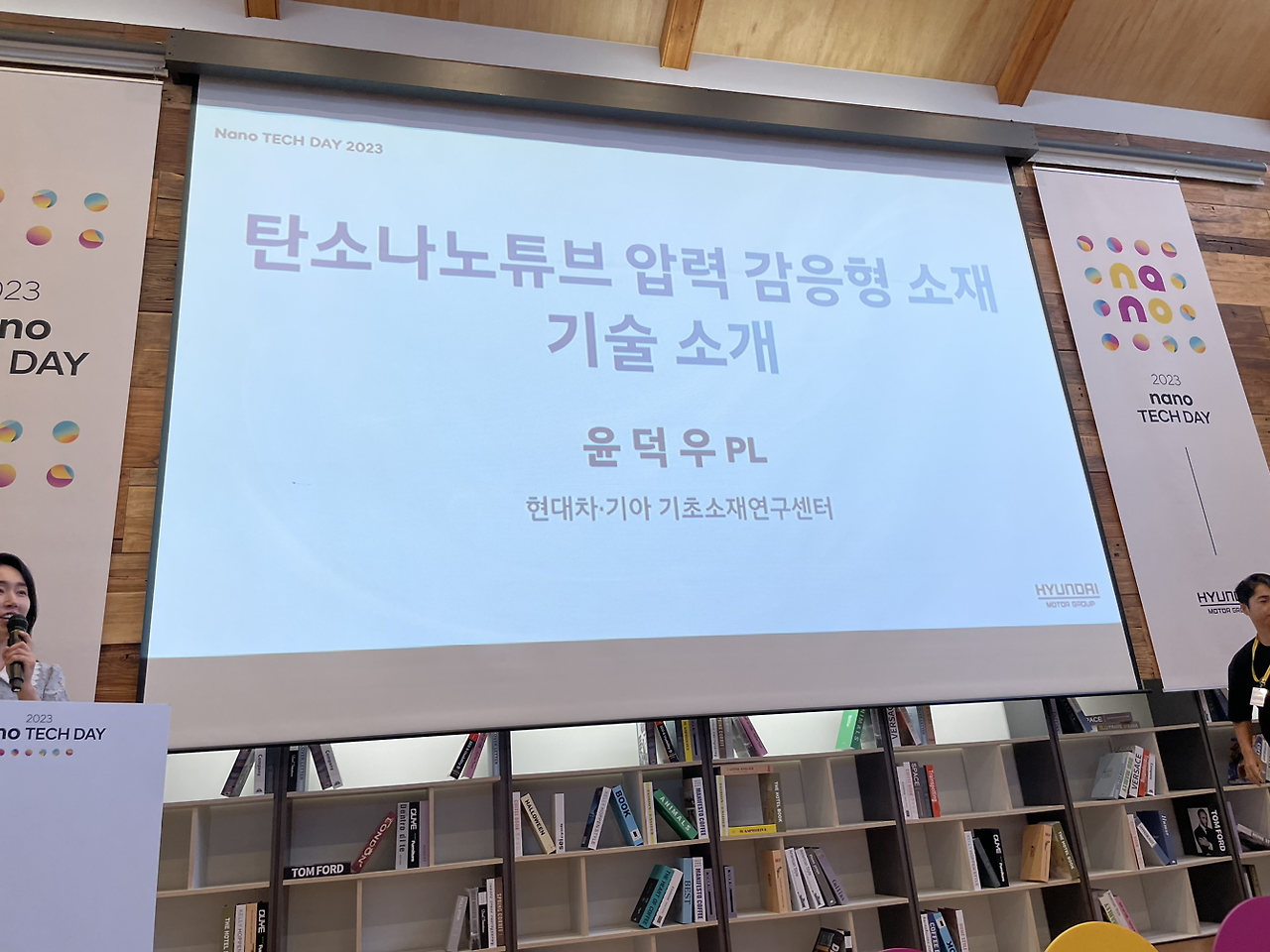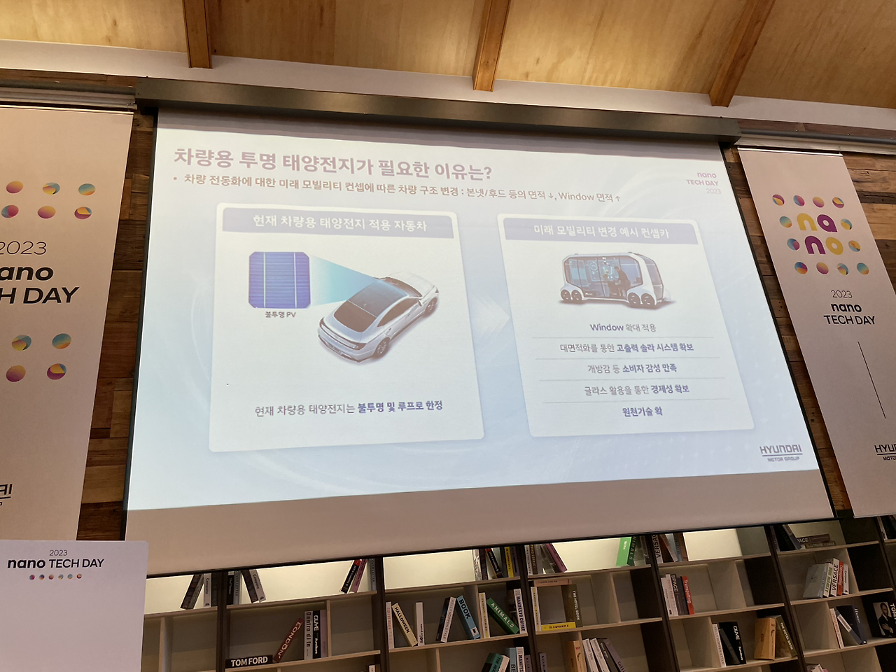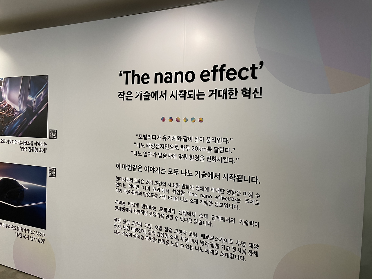 나노미터, 그러니까 십억 분의 1m에 해당하는 크기들을 다루는 기술입니다. 대표적으로 이야기가 많이 나오는 건 탄소 나노 튜브가 있지요. 이번 전시에서는 미래 모빌리티 회사로 성장하기 위해 진행 중인 연구들 중 6가지를 뽑아 보여줬습니다.