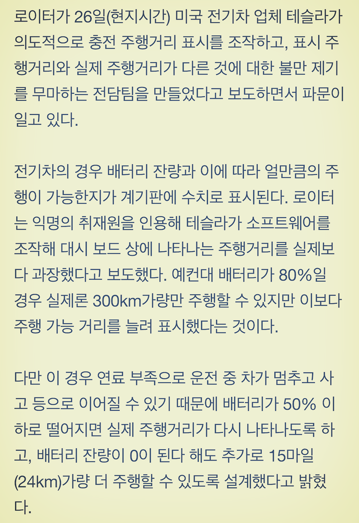 기존 자동차 회사들은 연비 과장 등으로 과징금을 받은 사례가 있고 그래서 전기차에서도 그런 법규 및 사회 통념적으로 기만행위가 될 수 있는 일을 하지 않습니다. 테슬라가 이런 것을 따라 하는 건 결국 그 차를 만들고 판매하는 사람들의 문제인 겁니다. 앞선 기술도 사람들에 의해서, 나쁜 마케팅도 사람들에 의해서 벌어지고 그 위에 일론 머스크가 있는 겁니다. 아무리 SDV(Software Defined Vehicle)의 선두 주자면 뭐 합니까. 그 좋은 기술을 사람들을 속여 더 차를 많이 팔고 주가를 올리는데 쓴다면요. 더 나쁜 일 아닌가요.