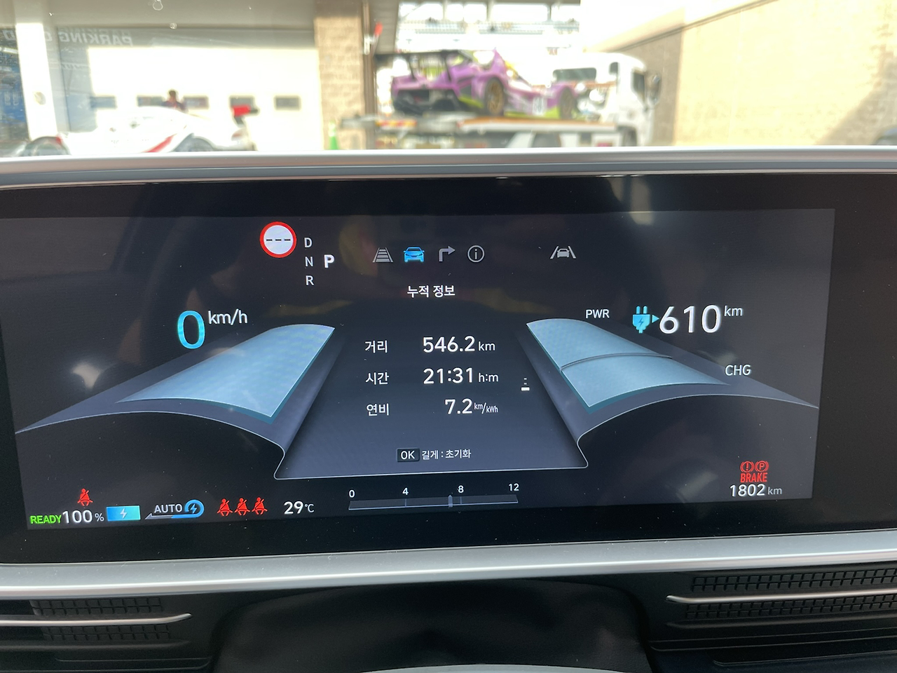 그간 제가 탔던 전기차들의 주행가능거리 표시는 두 종류였습니다. 하나는 앞서 설명한 내연기관 차처럼 누적 전비를 활용해 나타내는 것인데, 주로 현대차 계열은 최근 주행전비를 바탕으로 반영하더군요. 그래서 전비 주행(장거리 국도, 회생제동 최대, 운전자전용 냉난방 등)을 한 후 100% 충전을 하면 표시 주행가능거리가 훅 늘어납니다. 아이오닉6 롱레인지 2WD 18인치 휠 모델로 600km 넘는 주행가능거리도 확인했으니까요.