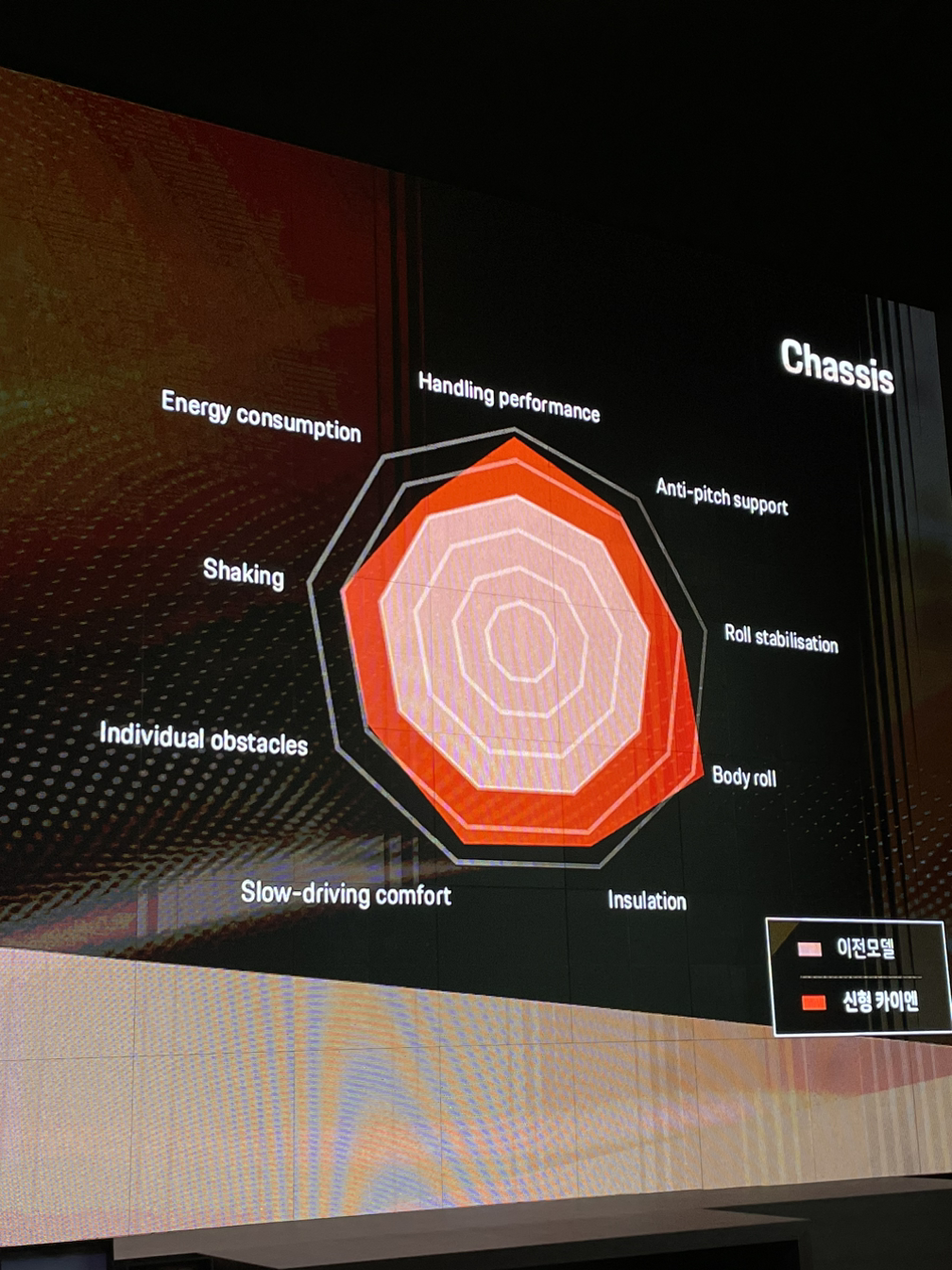 에어 서스펜션이 과거 3챔버에서 2챔버 방식으로 바뀌며 상하 움직임 제어용 밸브를 2개 넣는 방식을 썼다고 하네요. 이전 모델을 탔을 때도 ‘최고다’라고 생각했는데, 거기서 저속 승차감과 운동성을 더 개선했다고 하니 기술의 발전은 끝이 없나 봅니다.