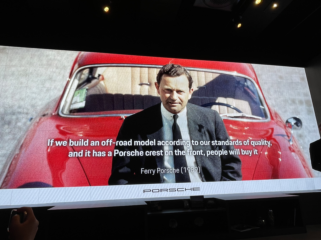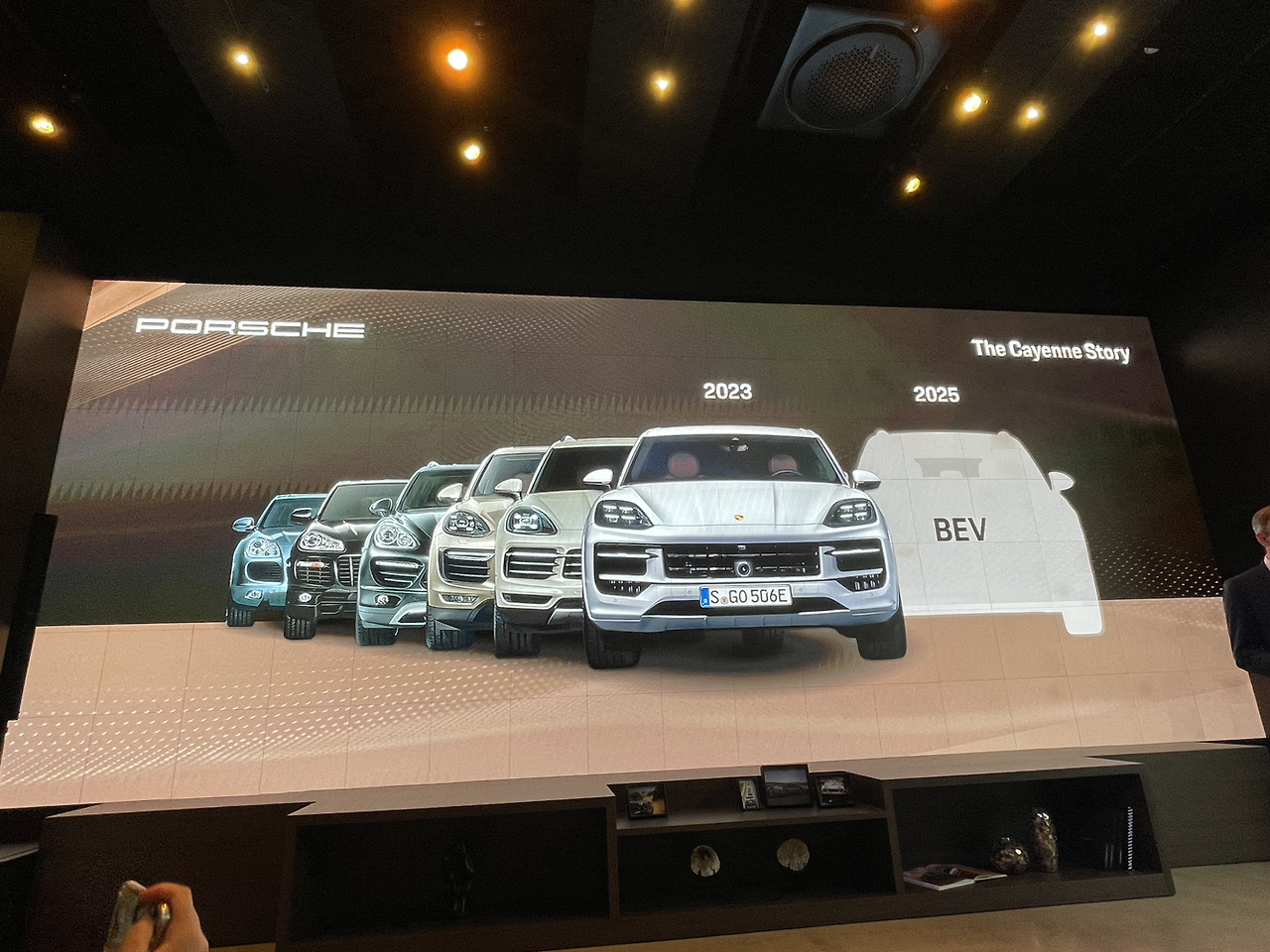 이 사진은 그동안의 역사를 보여 줍니다. 2002년 데뷔한 이래 SUV로도 스포츠카처럼 달릴 수 있다는 기준이 된 카이엔이, 2030년이 되면 라인업의 80%를 전동화하겠다는 계획에 따라 2025년에 배터리 전기차 버전의 카이엔이 나오게 될 것이라고요. 그래서 지금의 카이엔도 전기차인 타이칸의 여러 부분들을 가져온 것도 있습니다. 중간 단계인 것이지요.