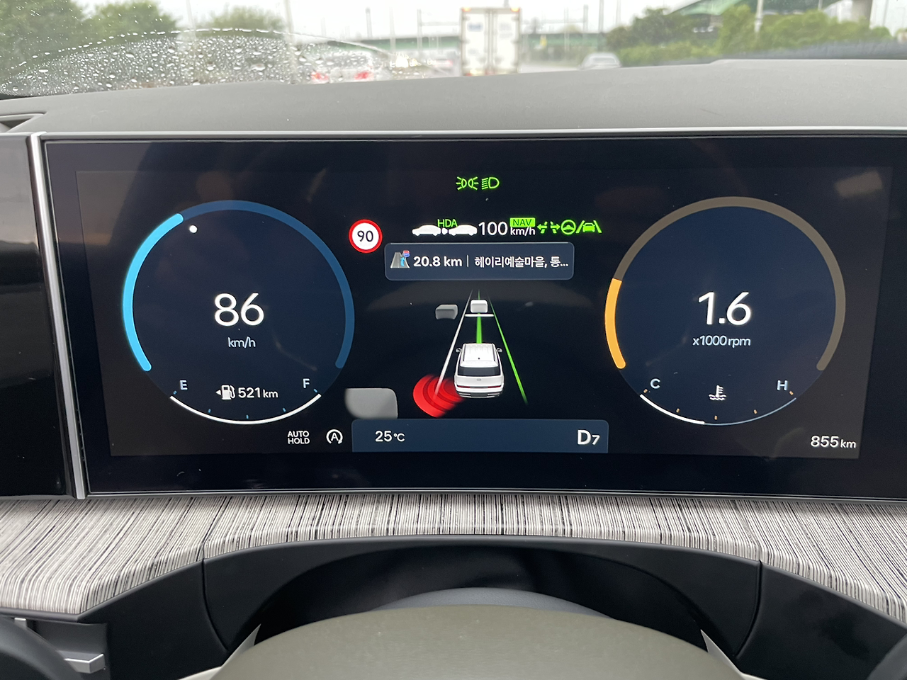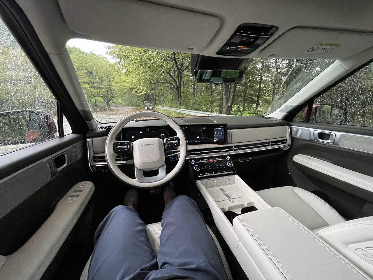 운전대를 매우 살짝만 잡고 있었기 때문에 차가 스스로 제어하는 영역이라 봐도 되는데요, 이게 꽤 많이 돌아가야 풀립니다. 이번 싼타페에서 LKAS와 LFA 기능이 강화되었다더니 진짜로 그러네요. 차로 유지 작동 방식도 더 민감하고 정밀해졌고요.