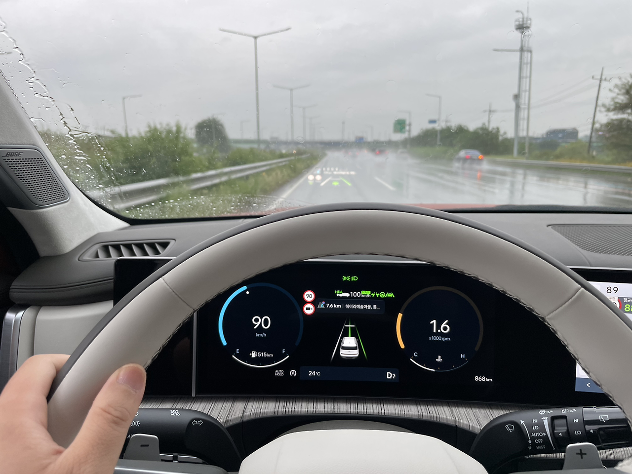 오는 길에 고속도로 주행보조 작동 중 고인 물을 지나며 바퀴가 물을 밟아 저항이 생기고, 스티어링이 일정 수준 이상 돌아가자 강제 해제가 되는 상황입니다. 왼쪽 앞바퀴가 시속 90km 정도에서 물을 밟았고, 이걸 이기고 직진을 유지하기 위해 운전대는 반대 방향인 오른쪽으로 돌아갑니다.