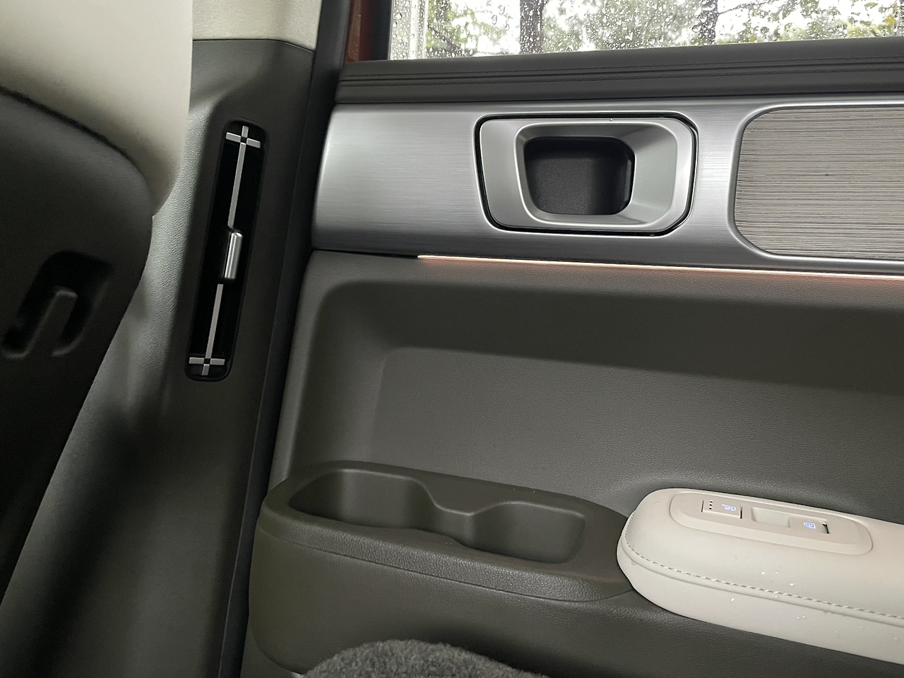 이 사진은 2열 컵홀더와 도어 캐치입니다. 이걸 왜 찍었냐면 꽤 섬세한 고민과 결과가 보여서입니다. 사진처럼 컵홀더의 크기가 다릅니다. 앞쪽이 크고 뒤가 작지요. 만약 이게 반대라면, 크고 높은 물병이나 텀블러를 뒤에 꽂으면 문을 열려고 도어 캐치를 잡을 때 방해가 될 수 있거든요. 크고 높을 가능성이 있는 음료수 등은 앞쪽에 꽂으라는 것이지요. 참 재밌는, 섬세한 배려입니다.