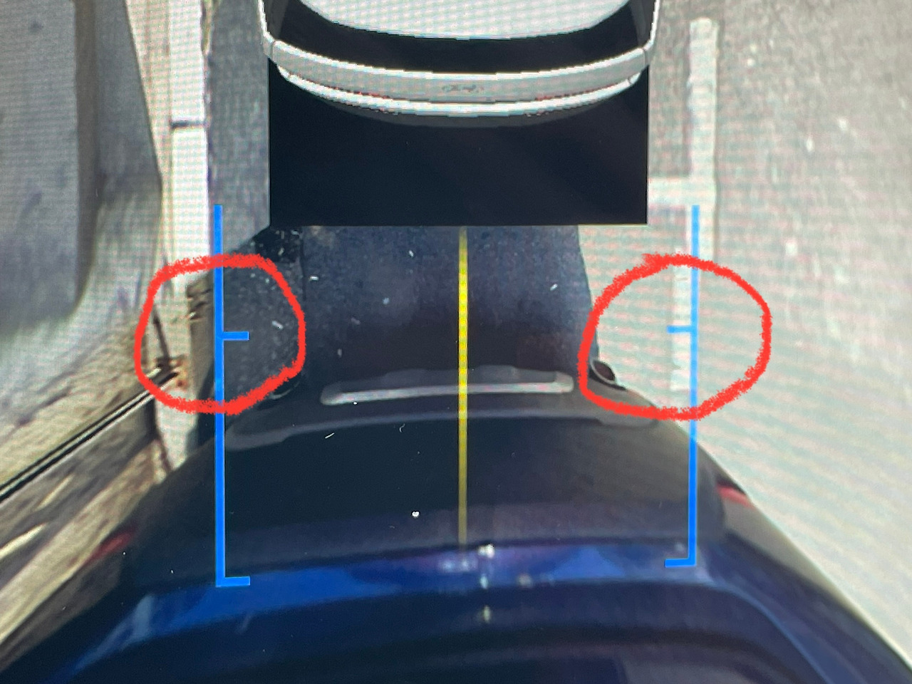 이건 후방모니터(서라운드뷰가 아니라도 기본으로 달립니다) 탑뷰 화면에서도 확인이 됩니다. 좌우 빨간 원 안에 있는 파란 표시선이 테일게이트 오픈 한계입니다. 5번 공간이 이렇게 보입니다.