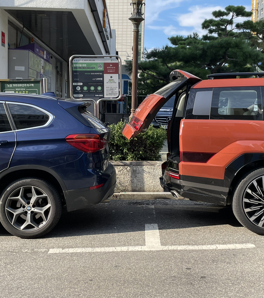 후진 주차를 하며 ‘이 정도면 안 닿을 것 같은데’라고 세운 후 실제 도어를 열어본 겁니다. 생각보다 아직 여유가 있더군요.