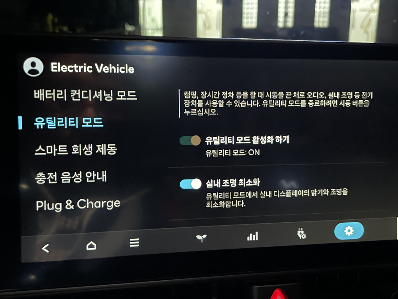 실제 하조대 해변에서 차박을 했는데, 꽤 편하게 잤습니다. 특히 현대차 그룹 전기차 특성 중의 하나인 유틸리티 모드를 작동하면 냉난방을 켤 수 있거든요. 밤 11시부터 아침 6시까지 23도로 맞춰 공조장치를 작동했는데, 배터리 변화는 4%였습니다. 굉장히 유용하지요.