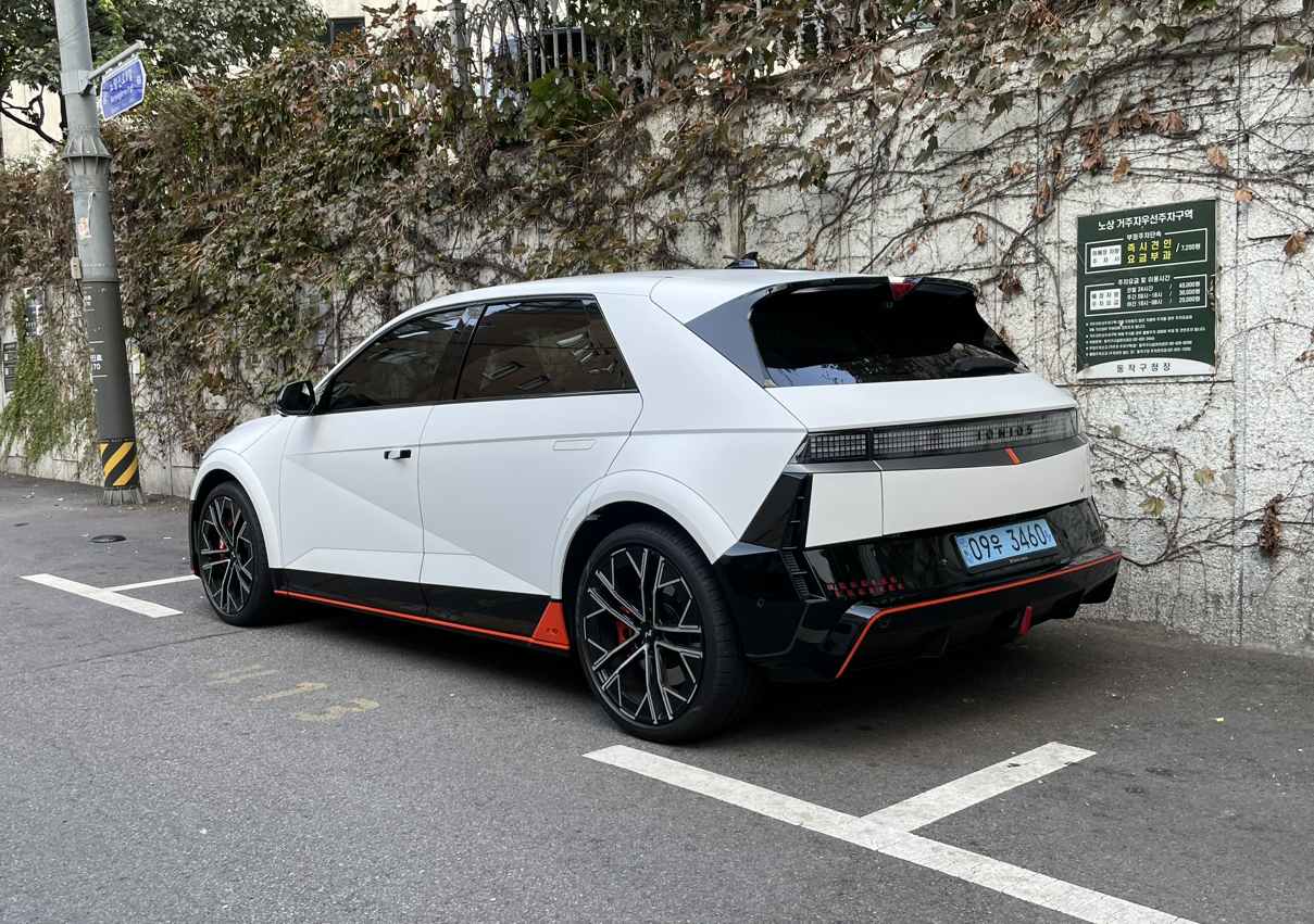 시승차는 아틀라스 화이트 매트 컬러입니다. 흰색 아이오닉5가 워낙 택시로 많이 팔려 어떨까 싶었는데, 실제 도로에서 보니 존재감이 큽니다. 앞 뒤 범퍼의 과격한 형상도, 리어 스포일러와 특히 삼각형으로 바뀐 보조제동등이 야간에 다른 느낌을 주더군요. 흰색도 괜찮겠다 생각이 들었습니다.