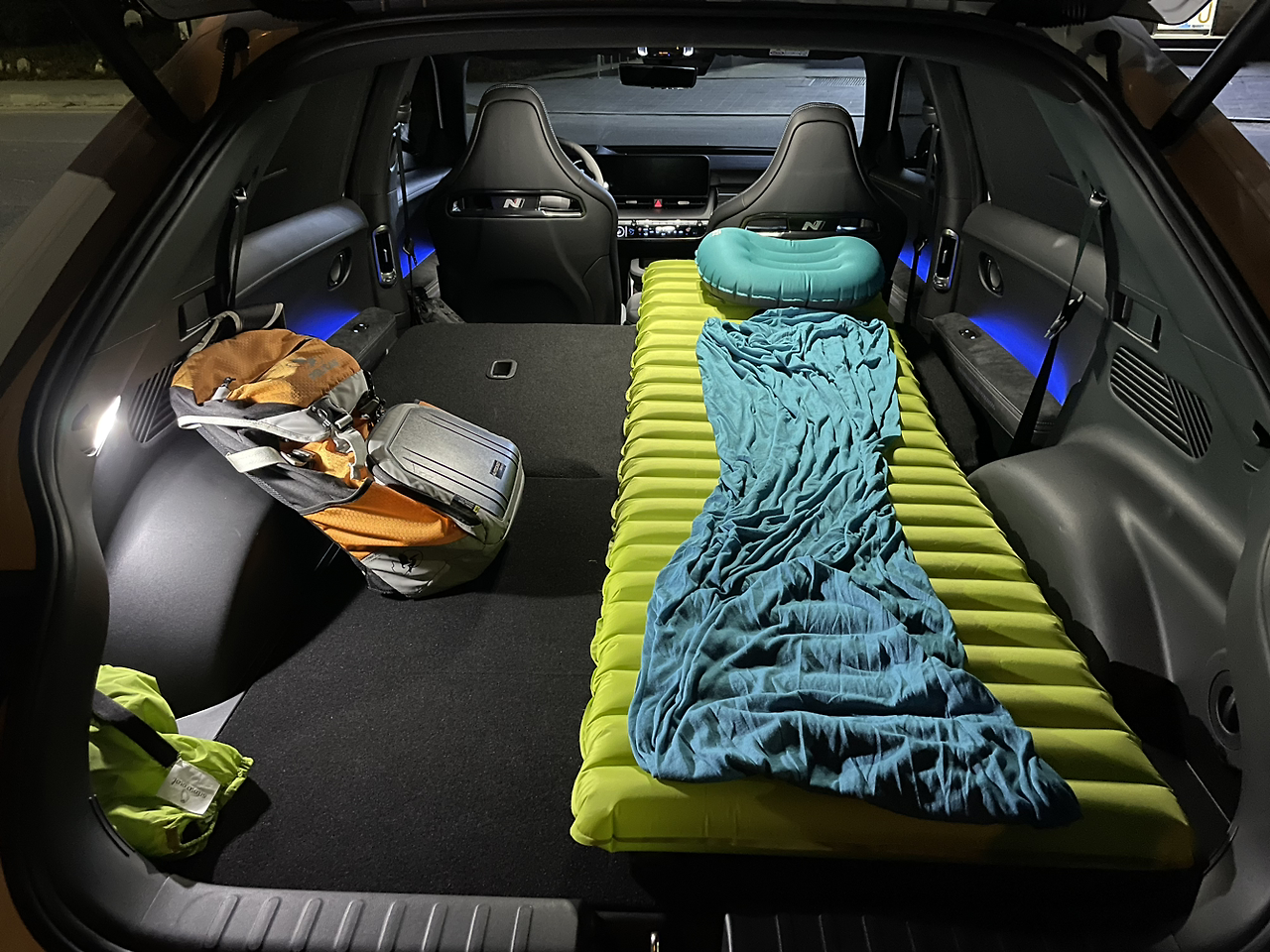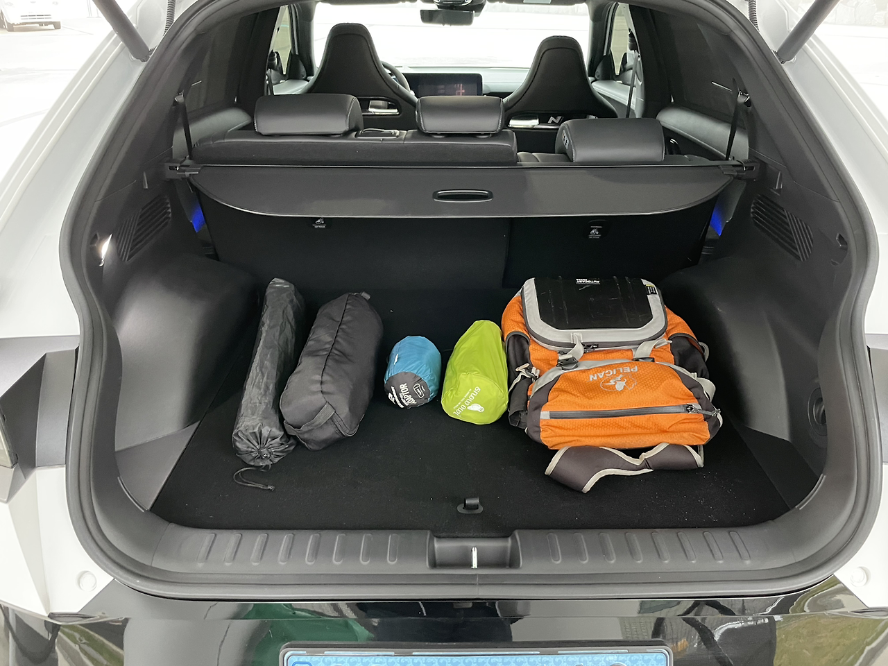 큰 차라는 건 넉넉한 트렁크와 ‘거의’ 평평하게 접히는 2열 시트 공간에서도 느껴집니다. 특히 슬라이딩과 리클라이닝이 되는 2열은 넓고 편해 누구를 태우더라도 여유 있고 좋습니다. 1열 시트를 조절하지 않았는데도 190cm 길이의 에어매트가 쉽게 들어가는 실내는 차박도 쉽습니다. 인버터가 바뀌며 트렁크 바닥이 좀 올라오긴 했는데 큰 차이는 없고요.