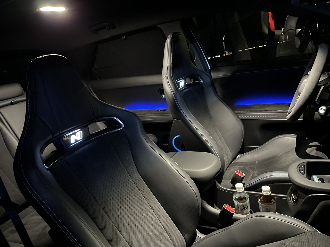 운전석의 스포츠 버켓 시트는, 전에 시승할 때도 느꼈는 데 시트 자체는 매우 훌륭한데 ’차종‘의 한계를 벗어나진 못합니다. 좋게 봐서 CUV인 아이오닉5의 높은 스티어링 칼럼과 시트 포지션을 낮춘다고 해결되는 건 아니니까요. 그래서 적당히 뒤를 올리고 수평을 맞춰도, 쿠션과 등받이 모두 잘 잡아줘 괜찮더라고요. 높게 앉는 포지션에는 적응이 필요하고요.