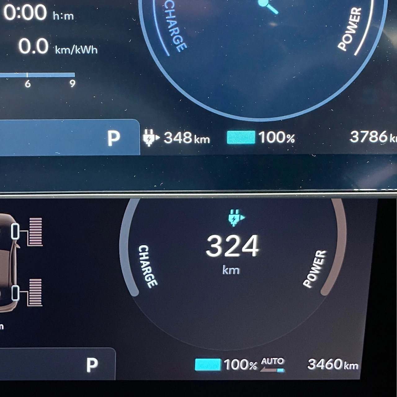 사진은 100% 완충 주행가능거리입니다. 아래쪽 324km는 차를 받아 초기에 충전했을 때, 위쪽 348km는 적당히(?) 탔을 때 늘어난 거리를 보여 줍니다. 앞서 이 차를 시승하신 분들보다 제가 운전을 살살한 모양이네요. ㅎㅎㅎㅎㅎㅎ 이 정도면 일상용으로도 큰 문제는 없겠던데요.