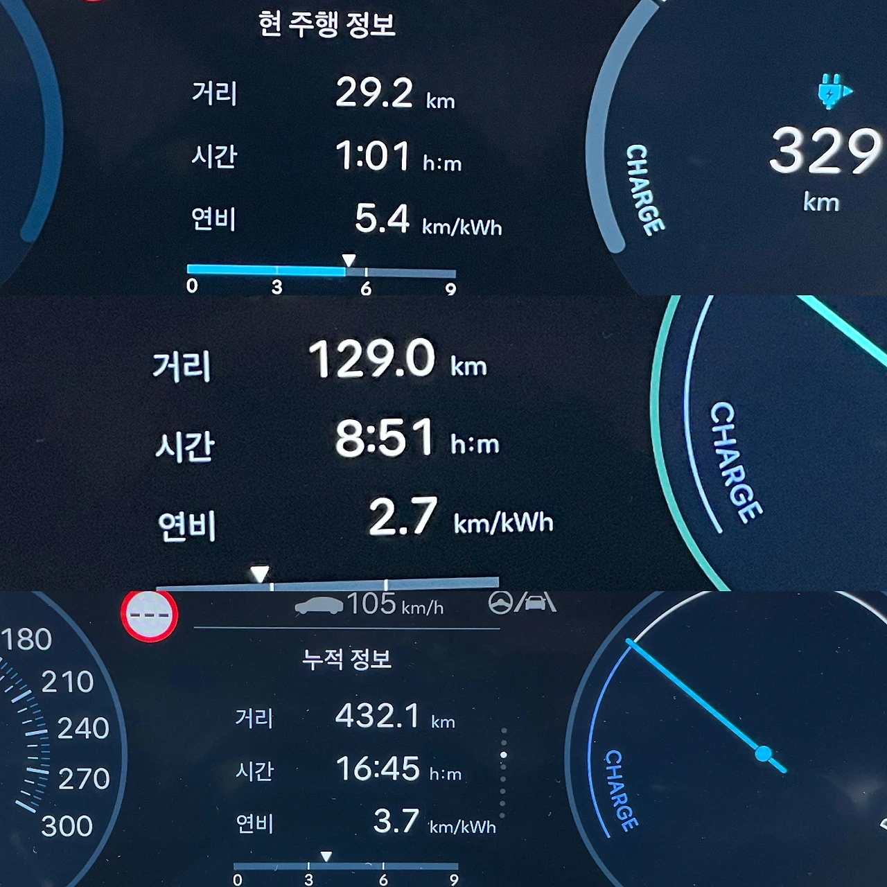 이 사진은 상황에 따른 전비들입니다. 5.4km/kWh는 에코모드+밀리는 시내80+전용도로20을 달린 결과입니다. 가운데 2.7km/kWh는 급가속과 감속이 포함된 장거리 초고속 주행 후이고요, 마지막은 제가 시승한 432km의 누적 전비로 3.7km/kWh입니다. 그간 평균이 4 이하로 내려간 적이 없는데… ㅎㅎㅎㅎㅎㅎㅎ