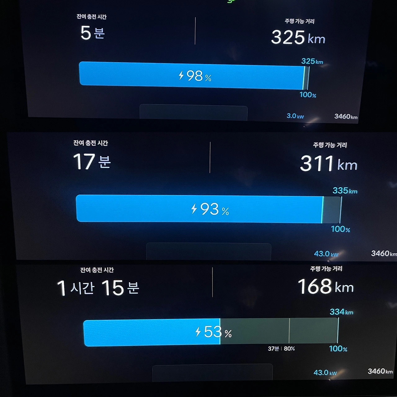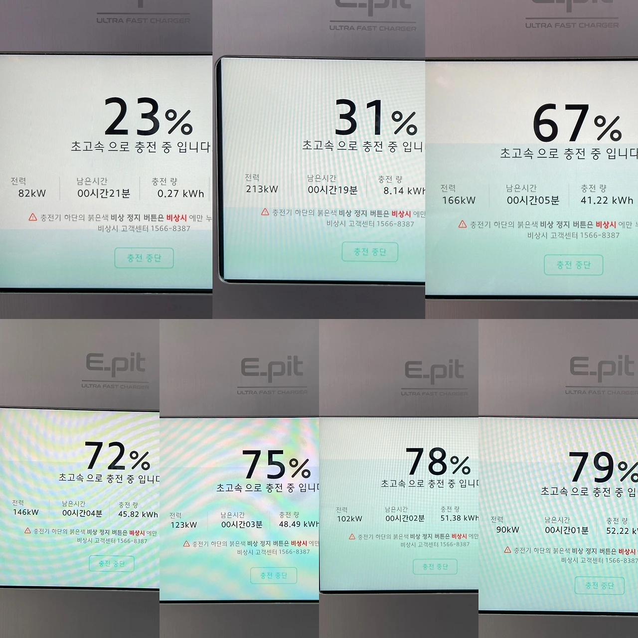 이 사진은 집 앞 50kW급 충전기에 물렸을 때, SOC별 충전 속도입니다. 처음 물린 54% 때부터 93%까지 43kWh를 유지하며 들어갑니다. 대체로 80%를 넘기면 충전속도가 느려지는 일반적인 전기차와 비교해 매우 매우 빠릅니다. 전에 기아 EV9을 시승할 때도 느꼈는데, 현대차그룹이 쓴다는 4세대 배터리는 에너지 밀도와 충전 속도가 확실히 달라졌군요. 54%에서 100%까지, 50kW급에서 총 1시간 15분 동안 47.11kWh를 채웠습니다. 정말로 빠른 속도입니다. 집 바로 앞이니 충전 걸어 놓고 들어 갔다가 완충되면 오는 알람 받고 나가서 차 옮겨 놔도 되겠더군요.