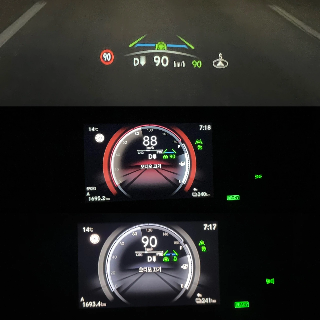 센터 스크린은 14인치라 큰데 계기판이나 헤드업 디스플레이는 지나치게 평범합니다. 공기 배출구가 높아 바람이 얼굴로 오는 것, 아틀란 맵이 다른 계기판과 메뉴와 비교해 지나치게 화려한 것 등은 좀 아쉽습니다.