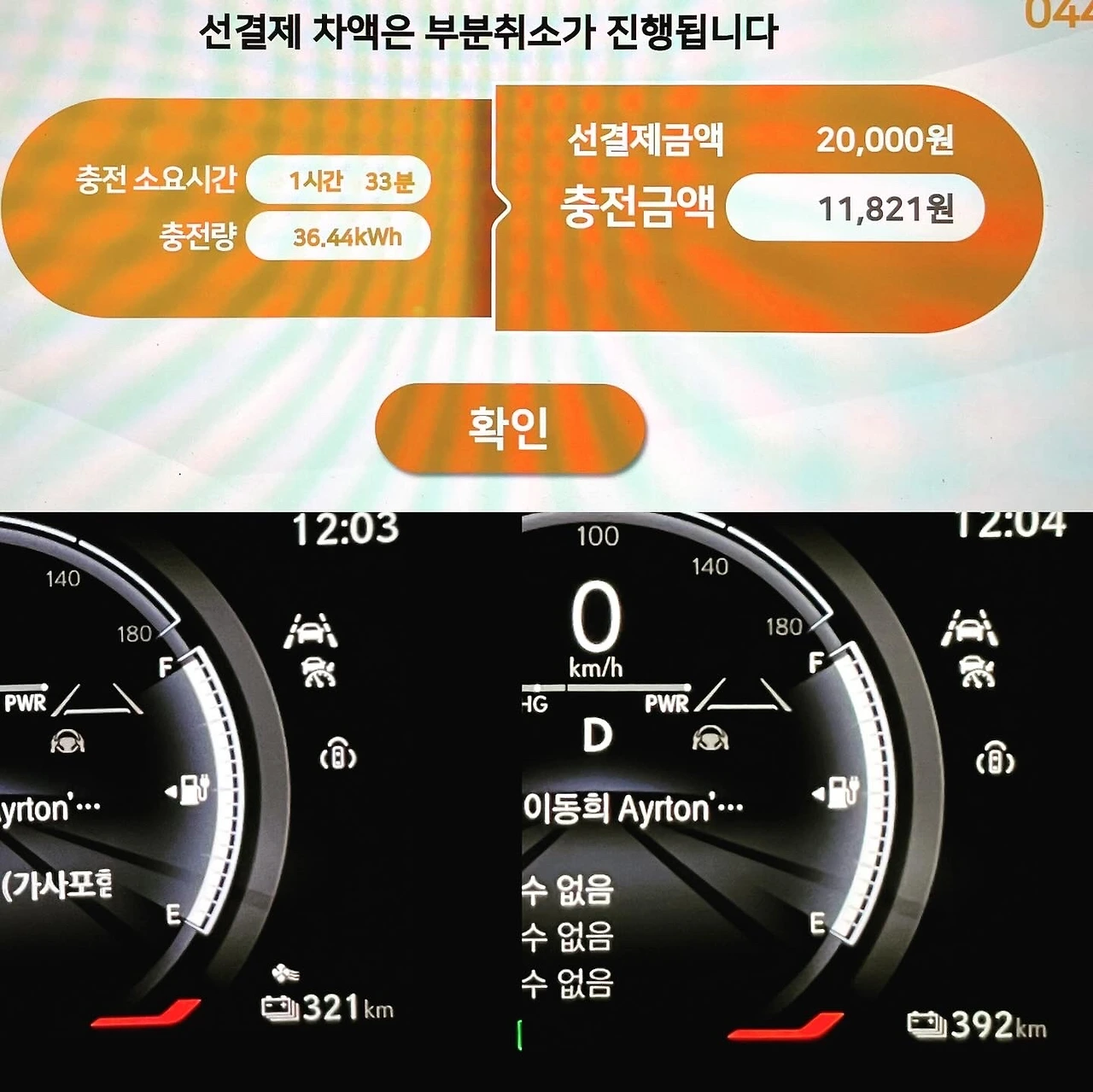 ‘자동차’로써 사용하기는 꽤 편하고 좋습니다. 반면 전기차로써는 아쉬운 부분들이 좀 있습니다. 충전량이 %나 kW 단위로 표시가 안된다는 사소한 것부터(엔지니어가 필요 없다 생각한 부분) 느린 급속충전 속도는 문제가 좀 있네요. 집 앞 50kW 충전기는 제가 어떤 전기차를 타도 다 꽂아서 100% 충전을 해보는 곳인데 두 번째로 느린 것 같네요. 또 다음 사진을 보면 100% 충전 후 공조장치를 풍량 1단+ 23도 상태로 온(321km)과 오프(392km)에 따라 주행가능거라 변화가 큰 것도 아쉽고요.