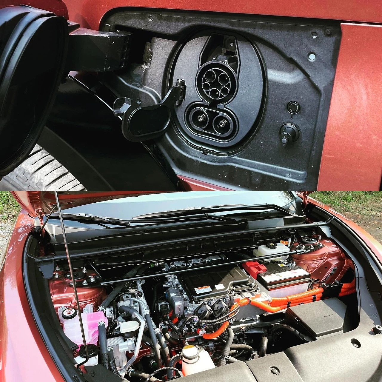 차 크기가 제네시스 GV70e, BMW iX3 등과 비슷한데, 공차중량 2090kg으로 100kg 이상 가볍습니다. 외장 곳곳에 알루미늄과 플라스틱을 쓰면서 강성 필요한 곳에는 스틸을 썼습니다. 앞 사진에 빨간 꽃무늬 박스가 자석으로 붙어 있는 곳은 철인데, 그 위는 복합재(플라스틱)입니다.