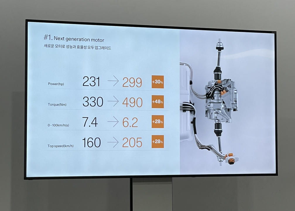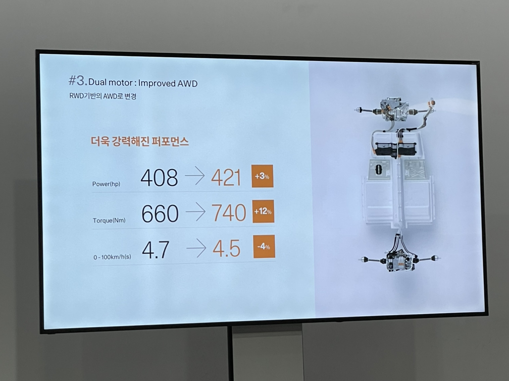 싱글모터는 앞바퀴굴림에서 뒷바퀴굴림으로 바뀌었습니다. 모터 위치뿐 아니라 출력이 크게 높아졌고 최고시속도 빨라졌습니다. 이쯤 되면 사실상 다른 차입니다. 전륜구동 228마력에 최고시속 160km인 차와 후륜구동 299마력으로 205km/h를 내는 차는 무게 배분, 주행 특성, 고속 조종성, 풍절음을 포함한 방음성능까지 거의 모든 것이 달라집니다. 이게 데뷔하고 2년 만의 변화라는 게 놀라울 따름입니다.