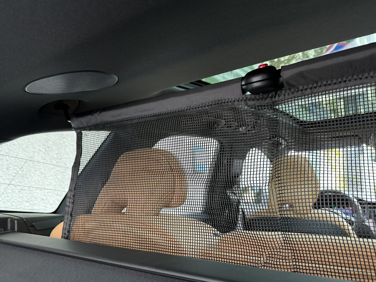 시승차에는 볼보 정품 액세서리인 나일론 보호망이 포함되어 있더군요. 이 사진처럼 천장 쪽에 철로 된 접이식 바를 펼치면 아래로 그물망을 내릴 수 있고, 아래쪽은 시트 뒤쪽 짐 고리에 걸어 당기면 단단하게 고정됩니다. 지금은 2열 위쪽에 달았는데, 이건 1열 바로 뒤에도 달 수 있습니다. 2열을 폴딩 했을 때에도 사용할 수 있는 것이지요.
