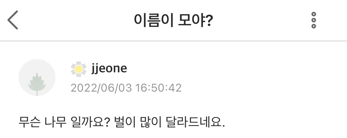 아빤 <귀욤 나무였나. 뭐라카더라>하더니 민박 아줌마한테 전화해 대뜸 마당에 있는 나무 이름이 뭐냐고 물었다. 아줌마도 모른다고 했다. 귀욤이라니. 오빠는 <아빠 말 다 사투리라 쳐봐도 안 나와여> 정녕 자신은 사투리를 안 쓰는 줄 아는 걸까. 나는 소명을 받은 신하처럼 저 나무 이름을 꼭 알아내야겠단 의지로 moyamo(모야모)라는 식물&나무 어플까지 깔았다.