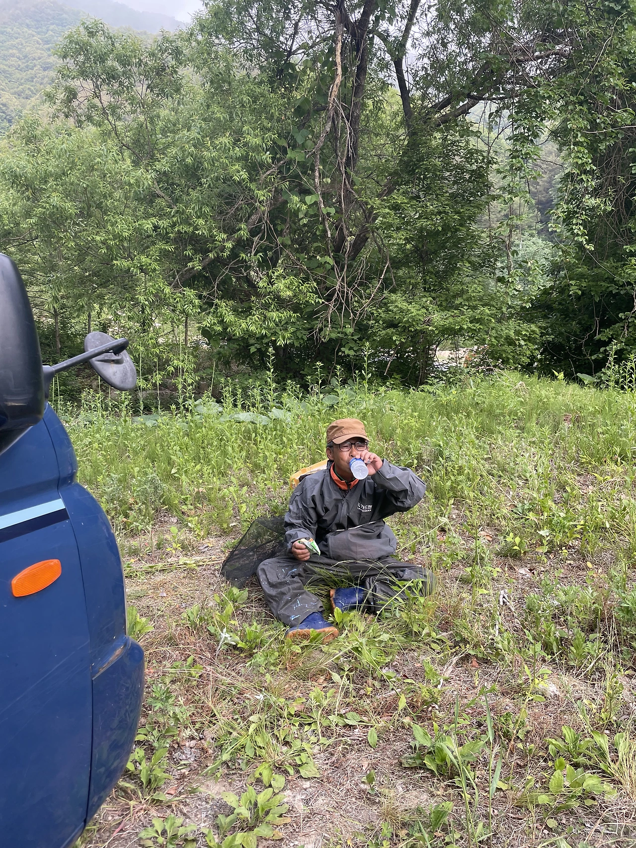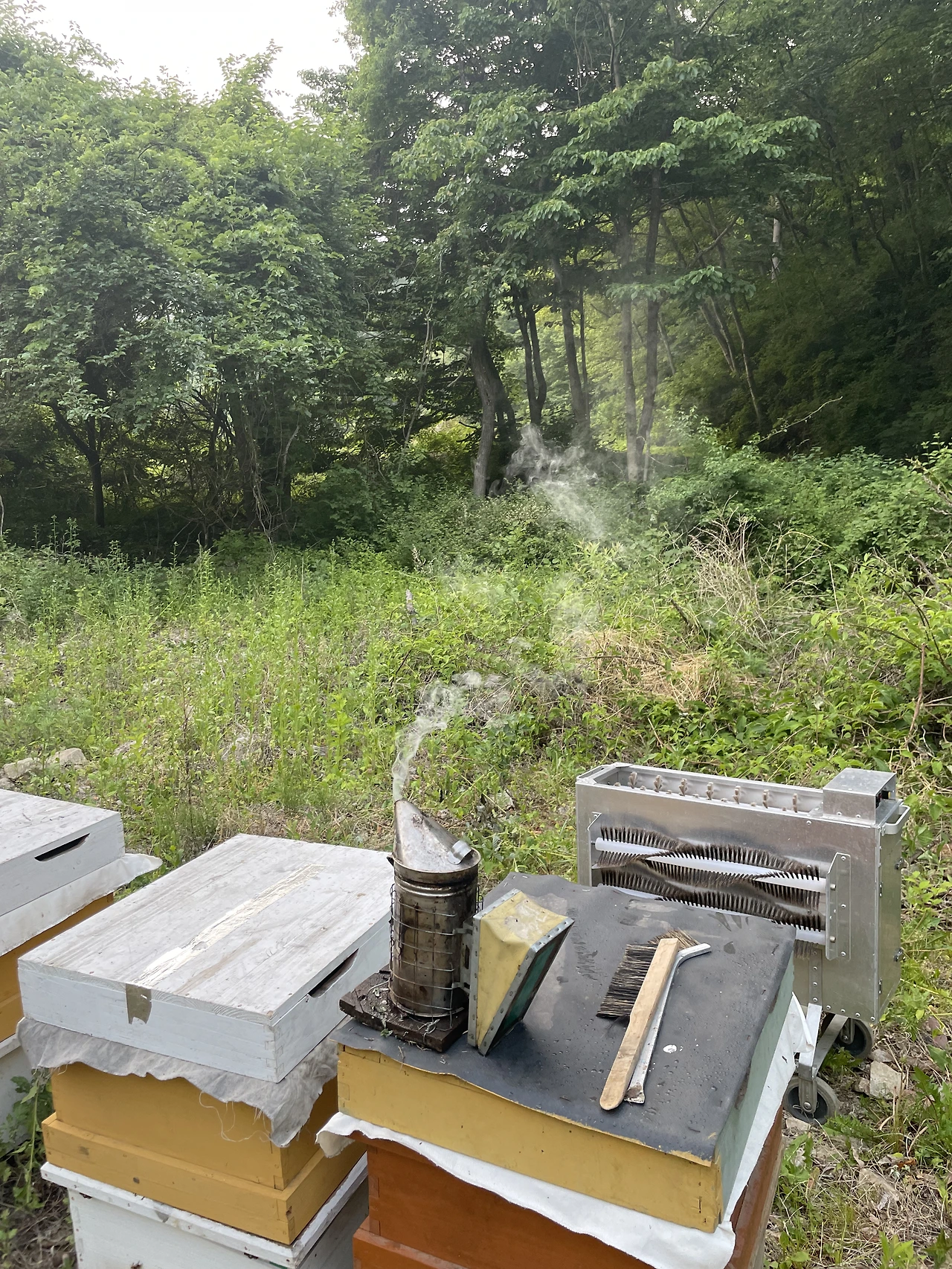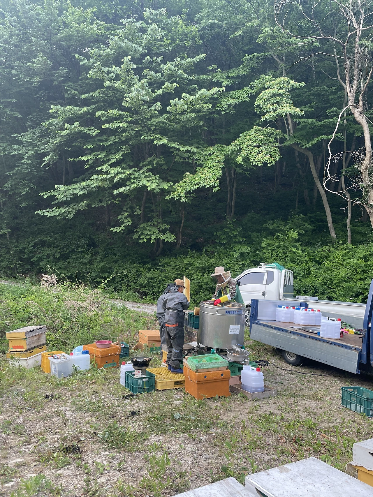 트럭에 탈봉기와 채밀기, 말통을 싣고 꿀을 뜰 장소로 향했다. 처음 해보는 것들이라 설레서였을까. 전날 한 번 와봤었는데도 오늘따라 더 멀게만 느껴졌다. 굽이굽이 휘어진 산길을 끝없이 올라갔다.