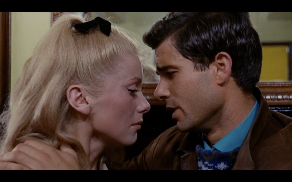 원색으로 도배되어 있는 벽들과 옷들은 이 영화의 질감을 색으로 설명하는 것 같습니다. 과장되어 있는 현실과 평범한 현실이 조화를 이뤄서 아득한 감정을 자아냅니다. 이런 과정 된 시각적인 요소는 영화의 대사 또한 뚜렷하고 흡사 춤 시위처럼 느껴집니다. 이 요소들은 정서적으로 강력하게 관객들을 끌고 나가지요. 그리고 일상적인 요소를 더욱더 부각하는 것 같습니다. 먼저는 드미의 부인인 아네스 바르다가 만든 영화에서 작고한 남편의 어린 시절을 묘사할 때, 드미의 아버지가 기이처럼 차고에서 일했다는 것을 말합니다. 그러한 사소해 보이지만 소중한 일상들은 쉘부르의 우산에서도 자주 등장합니다. 가령 '봉쥬르 bonjour'라는 인사말을 하나하나 음악적으로 배치하면서 더 많은 일상들의 조각들을 보여주고, 프랑스어가 갖고 있는 강한 리듬 패턴이 장면마다 독특하게 느껴집니다. 마지막 장면도 그렇죠. 대화를 마치고 헤어지는 장면에서 'Toi, tout va bien?' (잘 지내고 있어?), 'Oui, tre's bien.'(그래 잘 지내)라고 진부한 대사를 합니다. 어찌 보면 진부하지만 영화적으로 이야기가 갖고 있는 패턴들을 과감하게 포기하고 일상을 고스란히 표현하고 있다는 점에서 관객은 감독의 의도와 일치된 공감을 느낄 수 있다는 것이지요.
