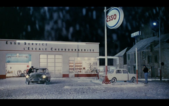 이 영화 내에서 에쏘 주유소의 이름은 'Escale Cherbourgeoise'이며, 이는 문자적으로 '쉘부르 사람들의 휴게소'라는 뜻이지만 우리는 'escalader'가 '오르다'라는 뜻이며, 'esclier'가 '계단'을 의미하는 것을 고려한다면, 이로부터 '부르주아의 계급 상승 abourgeois step up'이라는 옛날 말장난의 흔적을 좇을 수도 있습니다. 기이는 이제 안락한 중산층이며 쥬느뷔에브는 상류층이 되었습니다. 그들 사이의 계급적 차이는 이전보다 더 넘어설 수 없는 것이 된 것이지요. (로미오와 줄리엣이여..?) 그리고 에쏘 Esso라는 주유소는 뻔뻔한 간접광고...!? 처음에 등장하는 비와 후반부에 등장하는 눈은 운율적으로 수미상관을 이루지요.