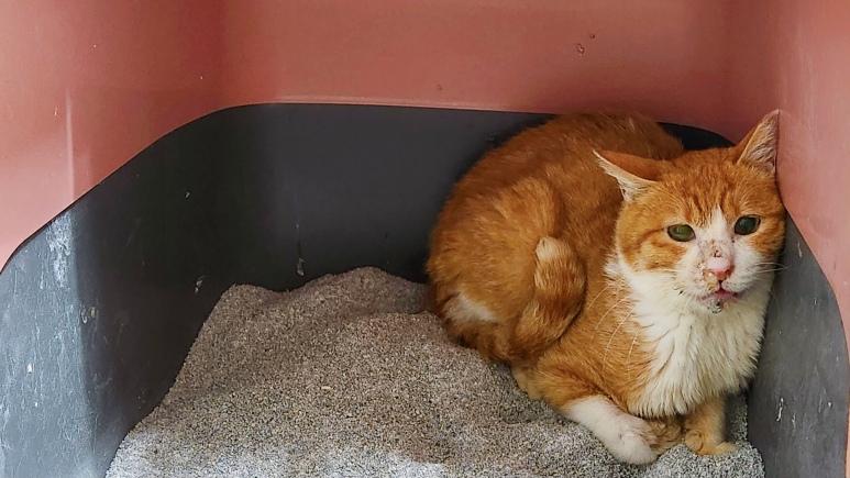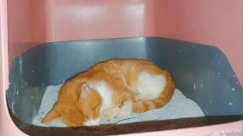 송이가 무척이나 싫어하겠지만, 숨숨집을 돌려 수건을 빼냈다. 이전에 담요를 갈아줄 때 보였던 무던한 반응과 달리 송이는 잔뜩 놀라 뛰쳐나왔다. 구조자 아저씨하고 있었던 일이 뇌리에 강하게 남아 있었나 보다. 옷방 문이 닫혀있는 것을 본 송이는 어디로 도망갈지 고민하다 모래 화장실에 자리를 잡았다. 그렇게 또 모래 화장실은 송이의 임시 재난 대피소가 되었다.