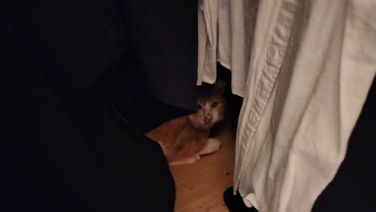 저녁을 먹고 병원에 들렸다가 집에 왔다. 송이가 자유롭게 다닐 수 있도록 문을 살짝 열어놓았었는데, 아쉽게도 문은 그대로였다. 옷장에 들어가서 송이가 밥은 잘 먹었는지, 물은 잘 마셨는지, 화장실은 잘 다녀왔는지 확인했다. 옷장의 옷 사이를 살포시 열어 송이가 자리에 있는 지 확인했는데, 송이는 도망가지 않고 '왜.'라는 표정으로 대답했다. 비록 애인은 경계하지만 나는 크게 경계하지는 않는 것 같아보였다.