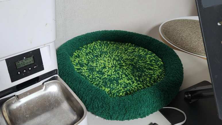 하염없이 사료통 앞에서 망부석처럼 앉아있는 따봉이가 안쓰러워서 남는 뜨개실로 쿠션을 떠줬다. 때마침 수면사가 왕창 남은 상황이라서, 코바늘로 바닥 부분을 뜨고 대바늘 메리야쓰 뜨기로 옆면을 만들었다. 따봉이는 희한하게 박스를 싫어하는 편이라 일부러 옆부분은 낮게 떴다. 실은 열심히 쿠션을 만들다가 비슷한 방석을 1만원 대에 파는 걸 보고 현타와서 중간에 한번 때려쳤는데, 정작 산 방석은 너무 커서 책상 위에 둘 수 없길래 다시 뜨개질을 시작했다. 개인적으로 코바늘 뜨개질을 그리 선호하지 않는 편이라서 대체 언제 다 뜨나 싶었는데, 뜨고나니 제법 그럴싸하길래 마음에 쏙 들었다. 그렇다고 두번 만들라고 하면 못할 것 같다.