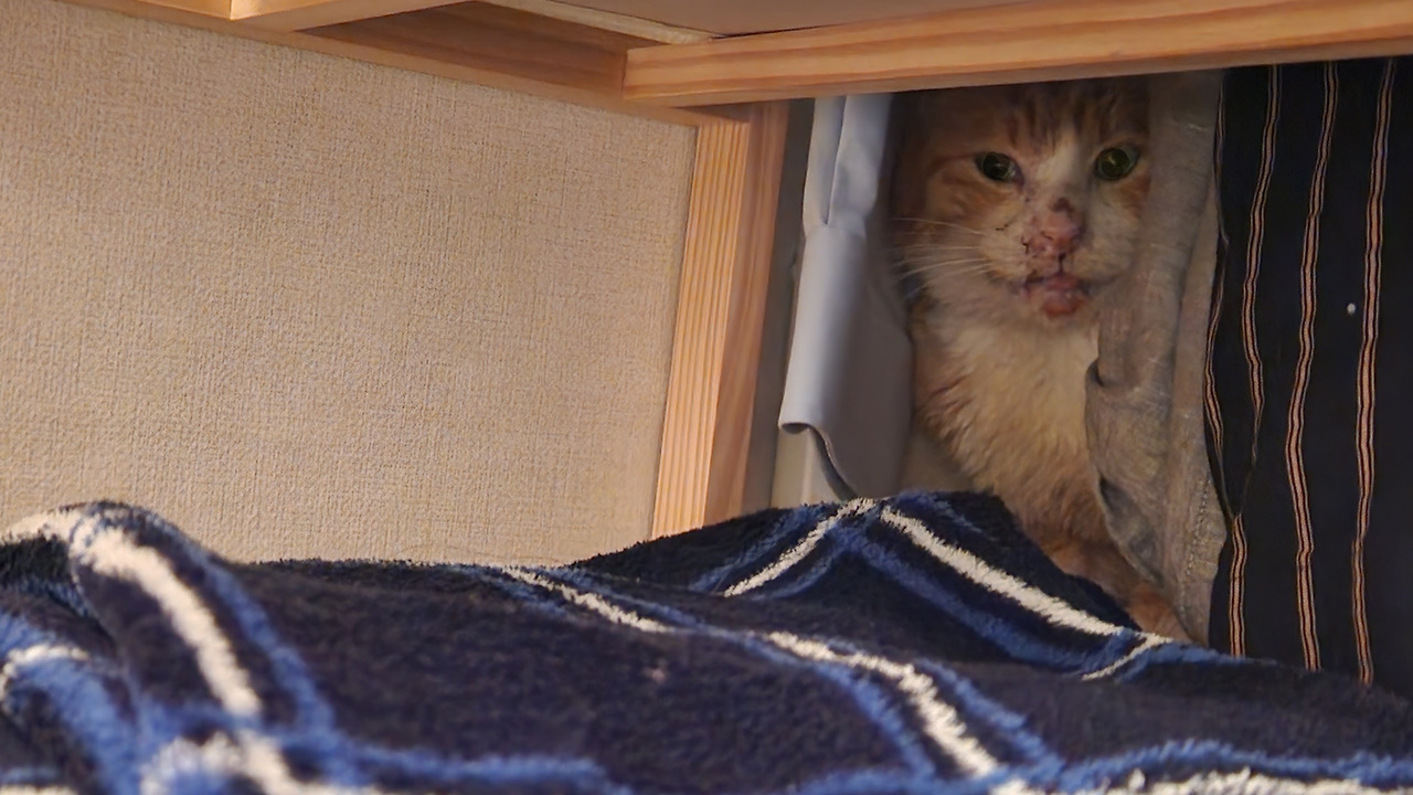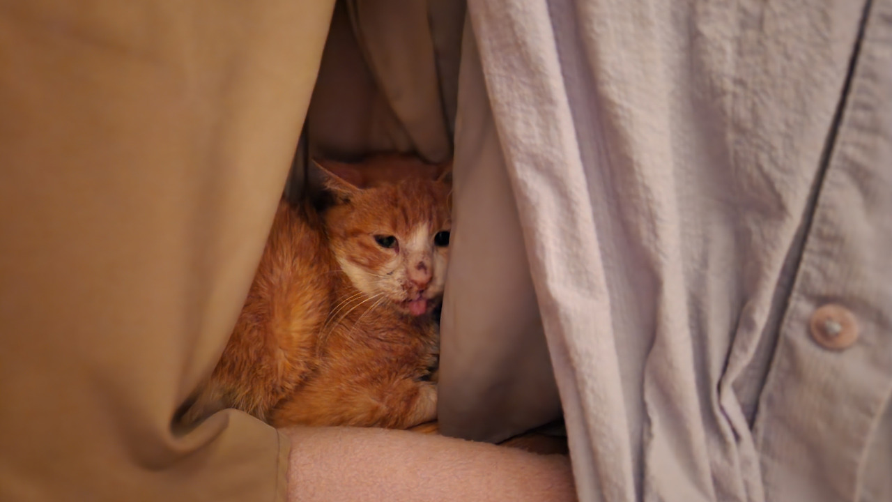 무섭지만 무섭지 않으면서도 무섭지만 무섭지 않아 한다는 말을 들으면 이건 또 무슨 소린가 싶을 것이다. 하지만 송이의 모습을 본다면 한 번에 이해할 수 있었다. 송이는 날 경계하면서도 한 편으로는 나는 자신을 해치지 않을 것이란 사실을 알고 있었다. 그렇지만 여전히 낯선 사람은 무서워서 옷가지들 사이로 스르륵 숨었다. 조금 용기를 내어 사진도 찍어보았다. 이동장에서 찍은 사진 이후로 처음 보는 송이의 얼굴이었다.