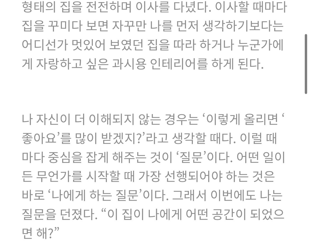 주변에선 오래 살던 동네나 회사 근처인 서울로 집을 구하지 않은 점을 의아해하기도 하는데, 그건 질문 한 사람들의 주거 기준이 나와 다르기 때문이다. 갸우뚱 한 사람들의 주거 우선순위는 본래 잘 알고 있는 동네에서 사는 안정성이나 회사 근처의 편의성, 혹은 부동산 투자가치를 내세울 이유도 있겠다.