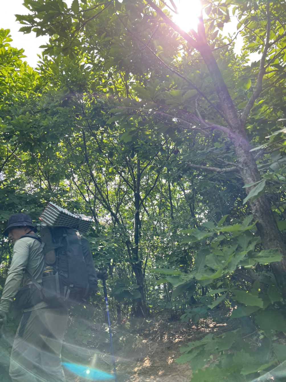 시간에 맞춰 정신없이 올라갈 때도, 바닥을 보면 꼼틀거리는 벌레들과 나뭇잎 사이로 비추는 초여름 저녁 만의 자연광을 보게 되는데, 보통날엔 보기 힘든 것들이라 백패킹 하는 묘미를 오랜만에 느꼈다.