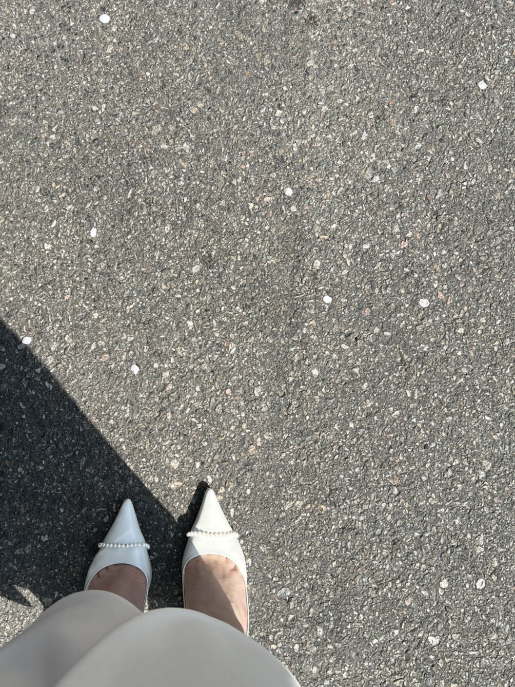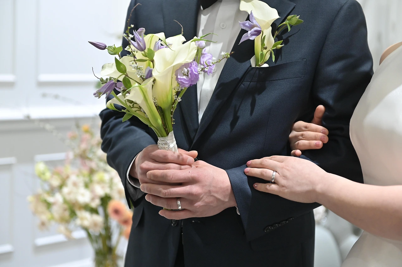 드레스가 민무늬에 재질로 승부하다 보니 주얼리와 신발, 베일, 부케 등의 부가적인 액세서리가 잔잔한 포인트가 되길 바랬다. 주얼리와 신발은 오직 진주, 베일은 2단, 부케 메인 꽃은 카라 재질에 좋아하는 연보라색의 작은 꽃들을 넣어 달라했다. (생각해보니 식 동안 부케와 드레스는 짝꿍처럼 붙어다녀서 꽃 한 번, 드레스 한 번 곁눈질하기에 편한 어울림을 원했다.)