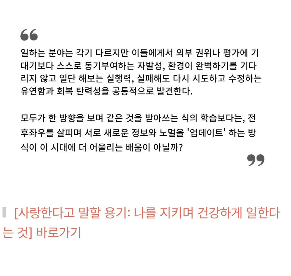 국가대표 선수들의 4년 뒤도 기약해 본다. 고도의 테크니컬 훈련과 채찍보다는 당근을 택하는 변화된 스포츠 문화에 힘입어, 꺾이지 않고 계속되는 마음을 보고 싶어졌다. 동시에 스포츠를 넘어 우리의 일상에도 끈기와 집중력의 힘을 당당하게 외쳐준 점이 자랑스럽다. 그런 의미에서 선수들의 앞날을 이미 본 듯 한 (오늘 인상깊게 본)글이자, 한 해를 앞둔 모두가 새기고 가면 좋을 문장으로 문을 닫아본다.