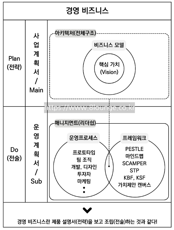 나는 경영의 큰 범주에서 파편처럼 흩어진 개념들을 숲을 보듯 한눈에 그 체계를 보고 싶었다. 그러나 전략과 전술의 각 구성을 한눈에 볼 수 있고 이론이 아닌 실전에 맞는 도표를 찾기란 매우 어렵다는 걸 알게 됐다. 그때부터 직접 도식을 만들기로 마음먹었다. 그리하여, 하나의 구성 체계를 그릴 수 있었는데, 바로 '경영 비즈니스 상호 관계도'라는 도식이다.