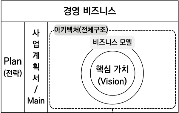 사업계획서가 어디 있는지 보이는가? 그렇다. 전략 범주에 위치해 있다. 도식에서 보듯, 핵심가치를 중심으로 비즈니스 모델의 전체 구조를 설명하는 문서가 바로 사업계획서다. 이것은 동적이 아닌, 정적인 문서라는 점을 꼭 기억하자.