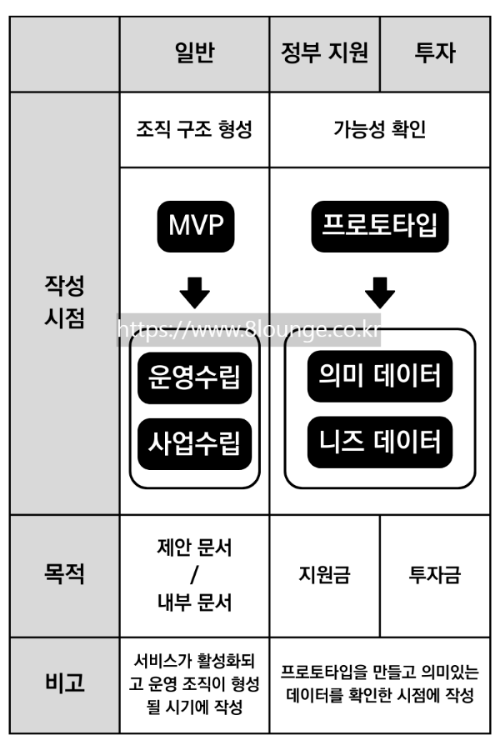 이처럼 자기 자본을 투자해서 사업을 시작하는 팀과, 정부지원 혹은 투자를 통해 빠르게 성장하고자 하는 팀은 목적과 상황 그리고 관점이 다르므로 업무 집중도도 달라진다. 이 말은 사업계획서를 수립함에 있어서도 사업계획서 작성 시점이 엄연히 다르다는 것을 뜻한다. 나는 이것을 하나의 도표('[그림 1]')로 나타내고자 한다.