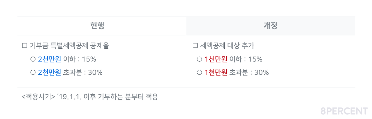 고액기부금의 기준이 변경되었습니다. 기존 2천만 원 초과에서 1천만 원 초과로 혜택 대상이 넓어졌습니다. 고액 기부 시 기부금액의 30%을 공제받을 수 있습니다. 올해 기부금 공제 한도를 초과했을 경우, 해당 연도의 기부금을 이월 공제하는 기간도 5년에서 10년으로 확대됐으니 참고하시기 바랍니다.