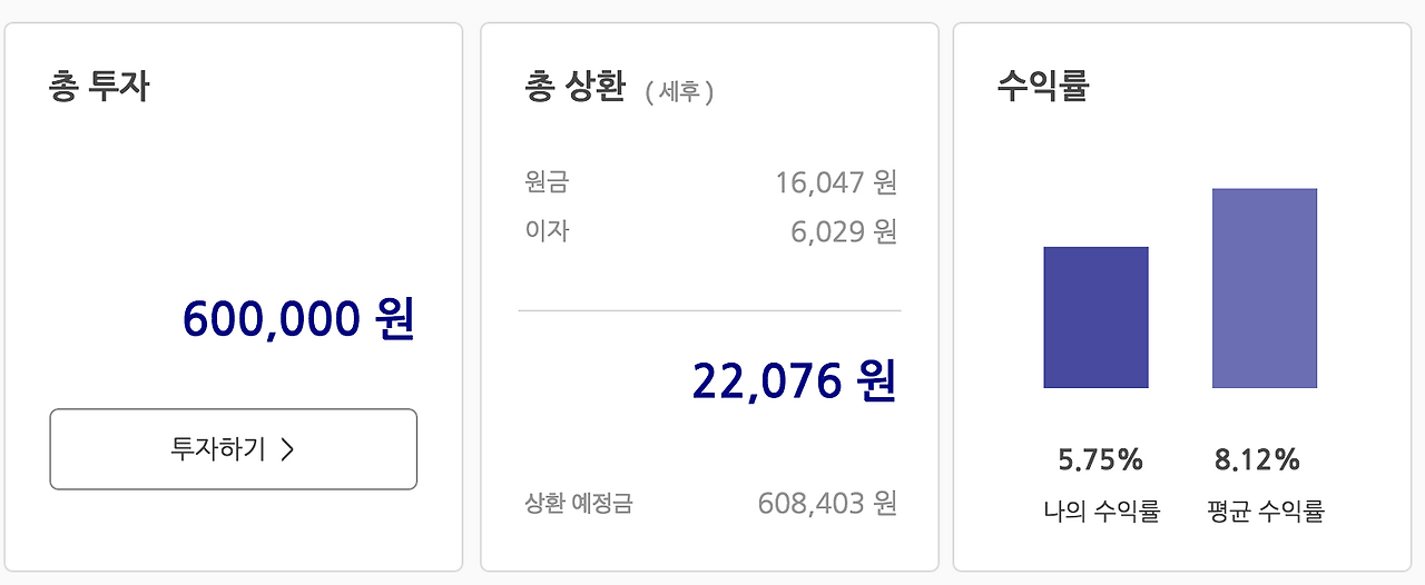 2) 상환받았으며 에 대한 정보는 원금과 이자를 분리하여 표기하였고 (정말 궁금한 것은 '이자'=수익에 대한 정보이기에!) 3) 받을 예정인가 - 상환 예정금을 표기하여 투자금 대비 총 상환금에 대한 예상을 가능하게 구성하였다.