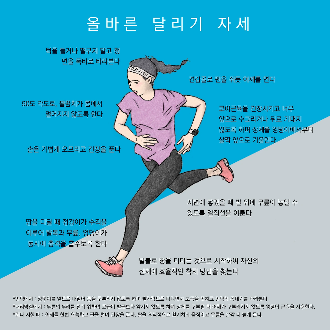 잘 달리는 방법을 정리하고 싶어서 그림도 그려봤다. 체중 때문에 무릎이 안 좋아져서 침도 몇 번 맞긴 했는데(한의사의 잔소리...), 그림을 그리던 2월 중순 즈음에 코로나 19 때문에 대회에서 환불 신청을 받기 시작하더니, 3월 2일에는 공식적으로 취소했다. 그래서 런린이의 마라톤 도전은 실패. 그림은 천천히 완성했다. 쓸모 없어지지 않도록 내년에는 마라톤 대회가 무사히 개최되었으면 좋겠다. 하루키는 달리기에 관하여 쓴 자신의 책을 이 문장으로 마무리했다. “이제까지 세계 여러 나라의 길 위에서 스쳐 지나며 레이스 중에 추월하거나 추월당해 왔던 모든 마라톤 주자들에게 이 책을 바치고 싶다. 만약 그 주자 여러분이 없었다면, 나도 아마 이렇게 계속 달리지는 못했을 것이다.” 달리는 것은 혼자 하는 것인 줄 알았는데. 나도 누군가와 함께 달리고 싶다. 가을이 되면.