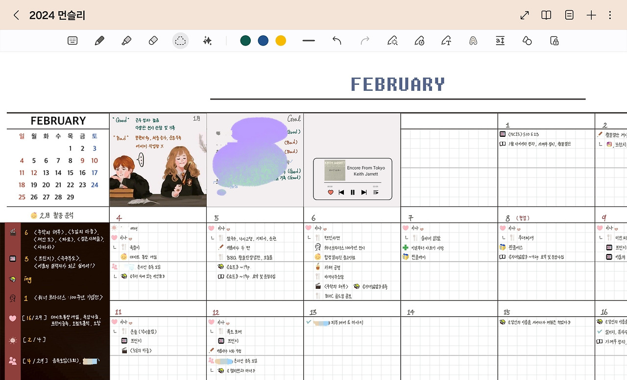 하지만 여전히 종이 다이어리 때 느꼈던 형식 문제가 해결되지 않았다. 다이어리에는 나에게 불필요한 형식이 매우 많았다. 나는 위클리와 데일리를 사용하지 않고, 오직 먼슬리만 사용했다. 연간 계획이나 버킷리스트, 가계부 같은 자잘한 페이지도 필요 없었다. 판매하는 태블릿 다이어리의 하이퍼링크 기능이 편하긴 했으나, 가장 중요한 먼슬리가 중심인 다이어리는 찾기 어려웠다. 결국 나는 먼슬리 형식을 따로 만들어서 사용했다. 하지만 이미지와 글씨가 늘어나자 로딩이 지나치게 오래 걸렸다. 또 한눈에 전체 내용을 파악하기가 어려웠고, 내용 검색 역시 불가능했다. 그렇게 태블릿 시대는 막을 내렸다(글 작업용으로는 여전히 잘 사용하고 있다).