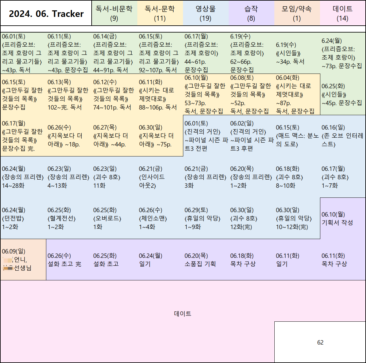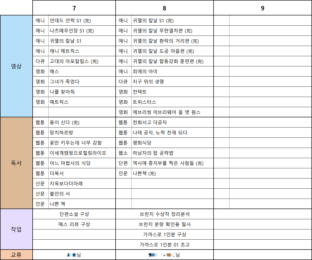 앞선 글에서 말한 것처럼, 안티-루틴인이라면 던 리스트를 시도해 보자. 던 리스트는 며칠 혹은 몇 주가 밀려도 채우는 게 어렵지 않다. 메신저나 사진첩을 찾으면 내가 누굴 만났는지, 뭘 먹었는지, 어떤 걸 봤는지 충분히 트랙킹할 수 있다. 날짜가 반드시 들어맞을 필요도 없다. 중요한 건 내가 그 작품을 보는데 시간을 투자했다는 사실이지, 그걸 본 게 지난주 화요일인지 수요일인지가 아니기 때문이다(물론 본인의 리듬을 좀 더 파악하고 싶다면 날짜가 중요하다. 나는 주로 화요일에 영화를 보는구나! 같은 것). 이 모든 건 할 일(To-do)이 아니라 한 일(Done)이기에 가능하다. 당신이 보낸 하루는 절대 그냥 증발하지 않는다. 부디 매일의 소중한 시간을 가시화해서 마음에 담는 경험을 많은 이들이 해보기를 소망한다. 그리고 본인에게 잘맞는 방법을 고민하면서 이전보다 스스로를 잘 이해할 수 있기를 누구보다 다정한 마음으로 응원한다.