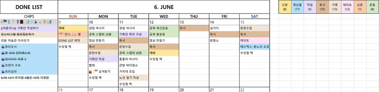 이게 현재 내가 사용하는 던 리스트 형식이다. 던 리스트는 상황에 따라 다르게 기능한다. 하는 일이 없거나 게으르게 느껴지는 날에는 아주 사소한 것까지 기록한다. 밥 먹는 것, 얼굴에 팩을 한 것, 산책하러 나간 것, 누워서 웹툰을 읽은 것까지도 말이다. 쓰다보면 생각보다 많은 일을 하면서 살고 있다는 걸 알 수 있다. 그리고 아주 일이 많고 바쁠 때는 삶이 원하는 방향대로 흘러가고 있는지 점검하기에 용이하다. 나에겐 문화 활동이 중요한데 지나치게 일만 하고 있다거나, 사람도 어느 정도 만나야 하는데 집에만 있었다거나, 애니는 많이 봤는데 영화는 한 편도 안 봤다거나 하는 점을 관찰하며 삶의 균형을 조율한다.