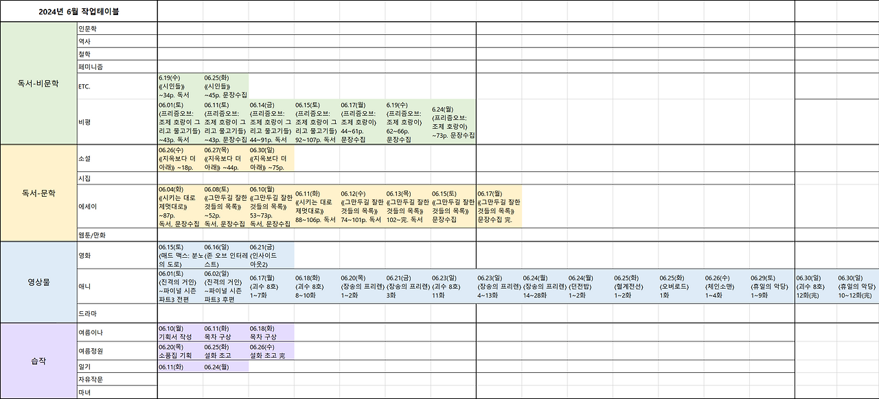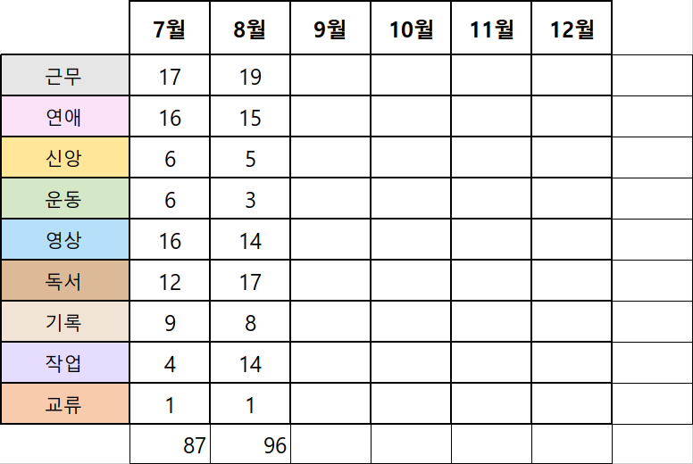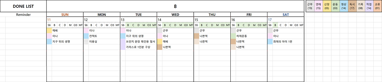나는 엑셀을 전혀 다룰 줄 몰랐다. 그래도 간단한 형식을 만드는 건 가능했다. 아쉽게도 스티커로 다꾸를 하는 건 끝내야 했지만, 내가 그토록 바랐던 시간 사용을 한눈에 보는 데에는 엑셀이 가장 적합했다. 로딩을 기다릴 필요도 없었고, 수정이 용이했으며, 검색 역시 가능했다. 이제 형식을 어떻게 개발할 것인가의 문제만 남아있었다.