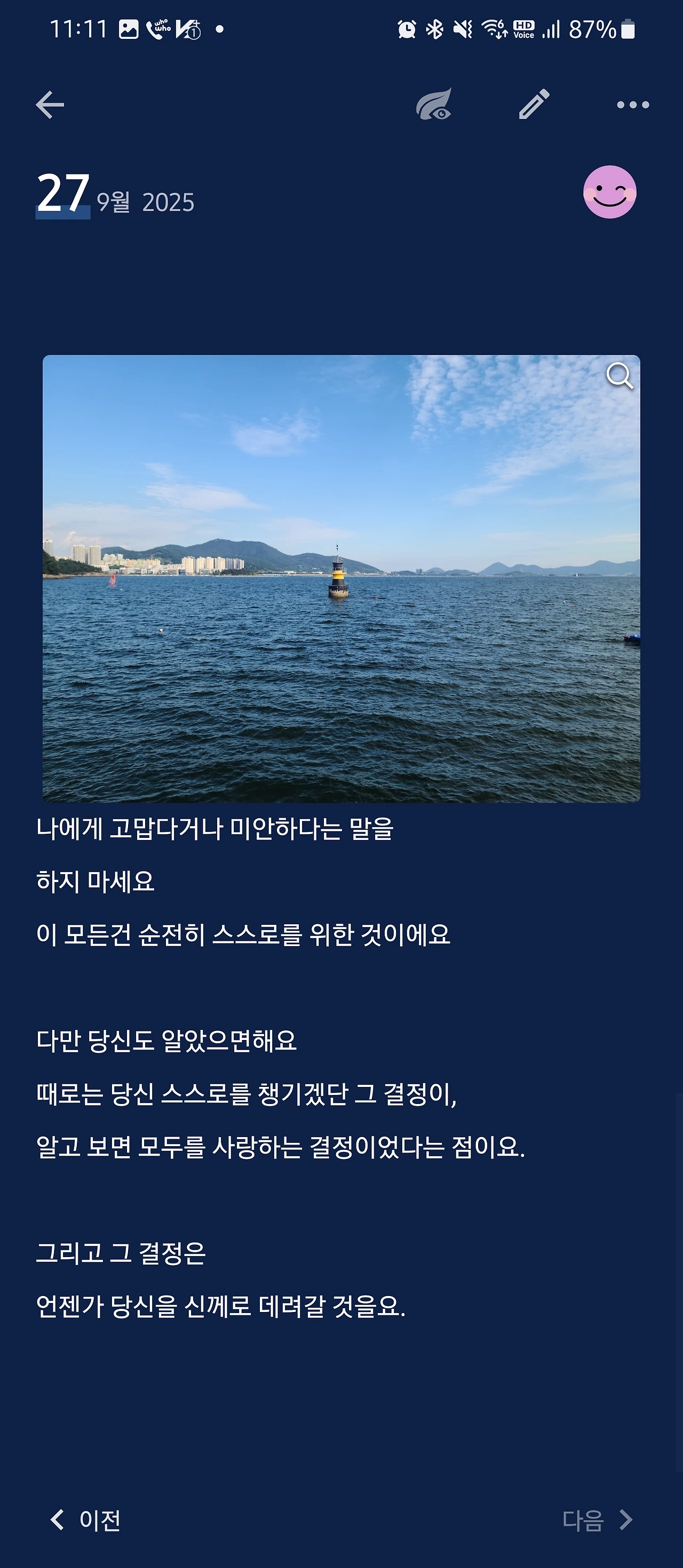 객실을 채운 초가을의 햇살. 태양빛이 수그러든 하늘. 이 여행은 도망이었어. 아득한 현실에서의 도망. 무력해 보이는 나로부터 도망. 남들은 무작정 떠난걸 대단하다고 말했지만, 나에겐 비겁한 행동이었는걸. 하지만 초가을의 햇살과 그것에 비친 풍경이 왜 이토록 애틋한 걸까? 왜 이만큼 설렌 걸까?
