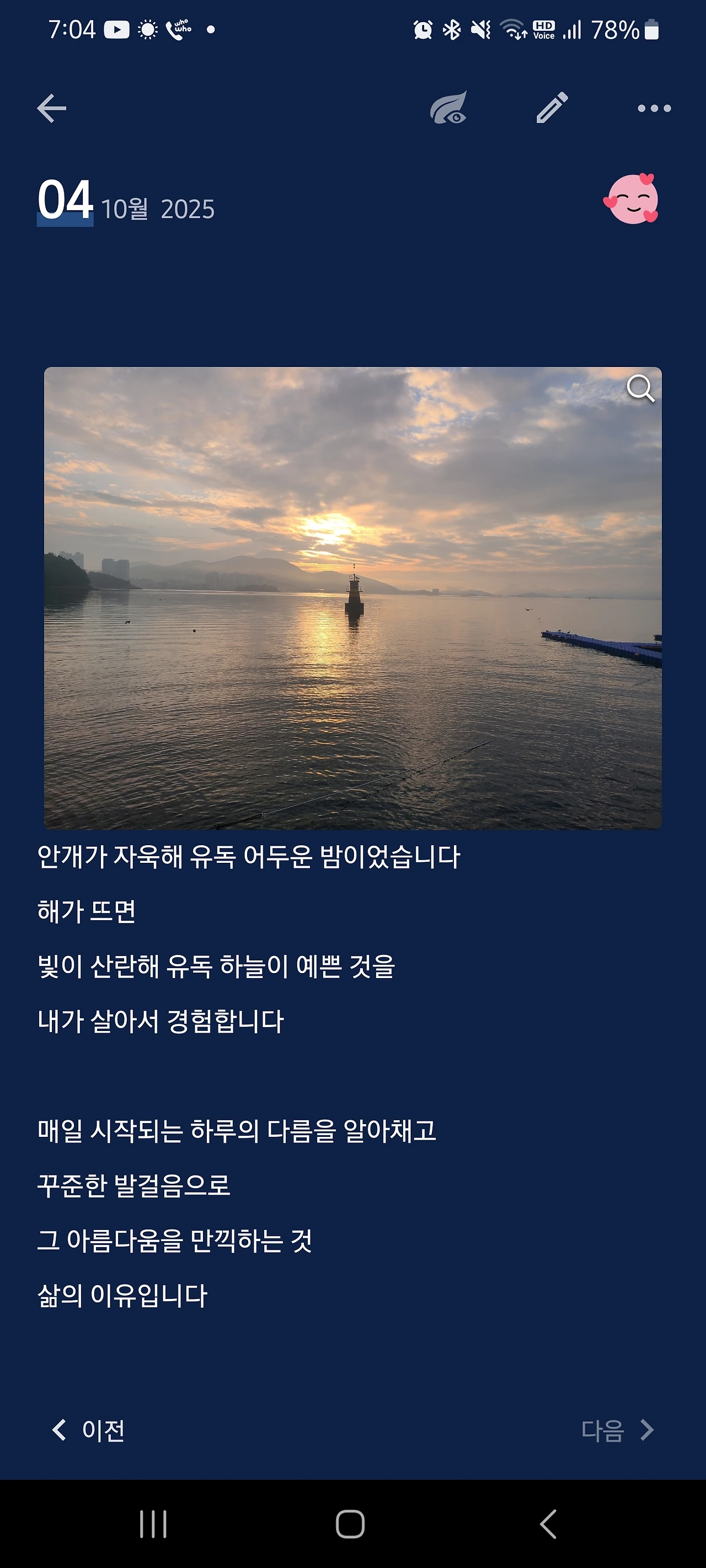 광경을 바라보며 매일 새로운 아름다움과 기쁨을 누리는 건 내 인생에 찾아온 천사에게 배운 것이다(지난 글 ‘살아간다는 것은 사랑한다는 것이다’ 참조). 40년을 한 장소에서 사진을 찍으며 누렸을 어르신의 기쁨을 이제야 비로소 누리며 글로 남긴다. 내게 찾아온 질병의 어둠이 기쁨을 막지 못했다. 오전 6시 일출이 시작되기 전 여명이 시작되는 시간, 벤치에 앉아서 해가 떠오르길 기다린다. 등대의 마음에 연결된다. 홀로 외로이 밝혔던 어둠이 끝나간다. 이제 어둠이 역전되어 빛이 온 세상을 감싸 안을 것이다. 매일 달라지는 감동이 몸에 쌓여간다. 살아있음의 의미를 깨닫게 된다.
